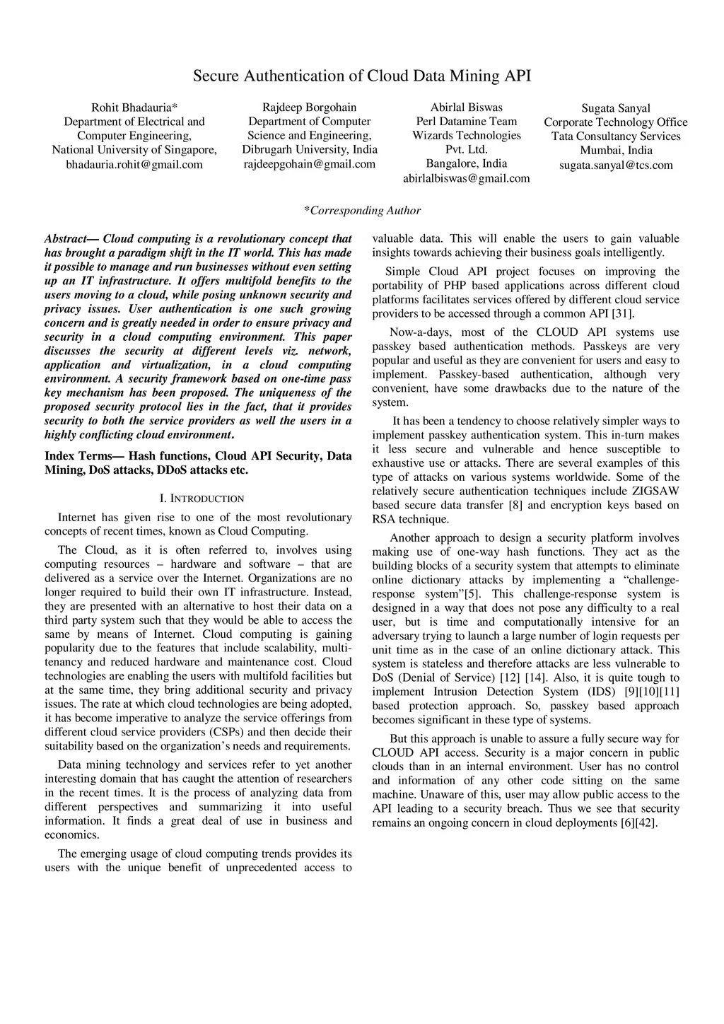 Cloud computing is a revolutionary concept that has brought a paradigm shift in the IT world. This has made it possible to manage and run businesses without even setting up an IT infrastructure. It offers multi-fold benefits to the users moving to a cloud, while posing unknown security and privacy issues. User authentication is one such growing concern and is greatly needed in order to ensure privacy and security in a cloud computing environment. This paper discusses the security at different levels viz. network, application and virtualization, in a cloud computing environment. A security framework based on one-time pass key mechanism has been proposed. The uniqueness of the proposed security protocol lies in the fact, that it provides security to both the service providers as well the users in a highly conflicting cloud environment.