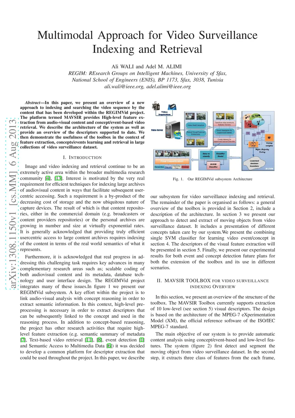 In this paper, we present an overview of a multimodal system to indexing and searching video sequence by the content that has been developed within the REGIMVid project. A large part of our system has been developed as part of TRECVideo evaluation. The MAVSIR platform provides High-level feature extraction from audio-visual content and concept/event-based video retrieval. We illustrate the architecture of the system as well as provide an overview of the descriptors supported to date. Then we demonstrate the usefulness of the toolbox in the context of feature extraction, concepts/events learning and retrieval in large collections of video surveillance dataset. The results are encouraging as we are able to get good results on several event categories, while for all events we have gained valuable insights and experience.