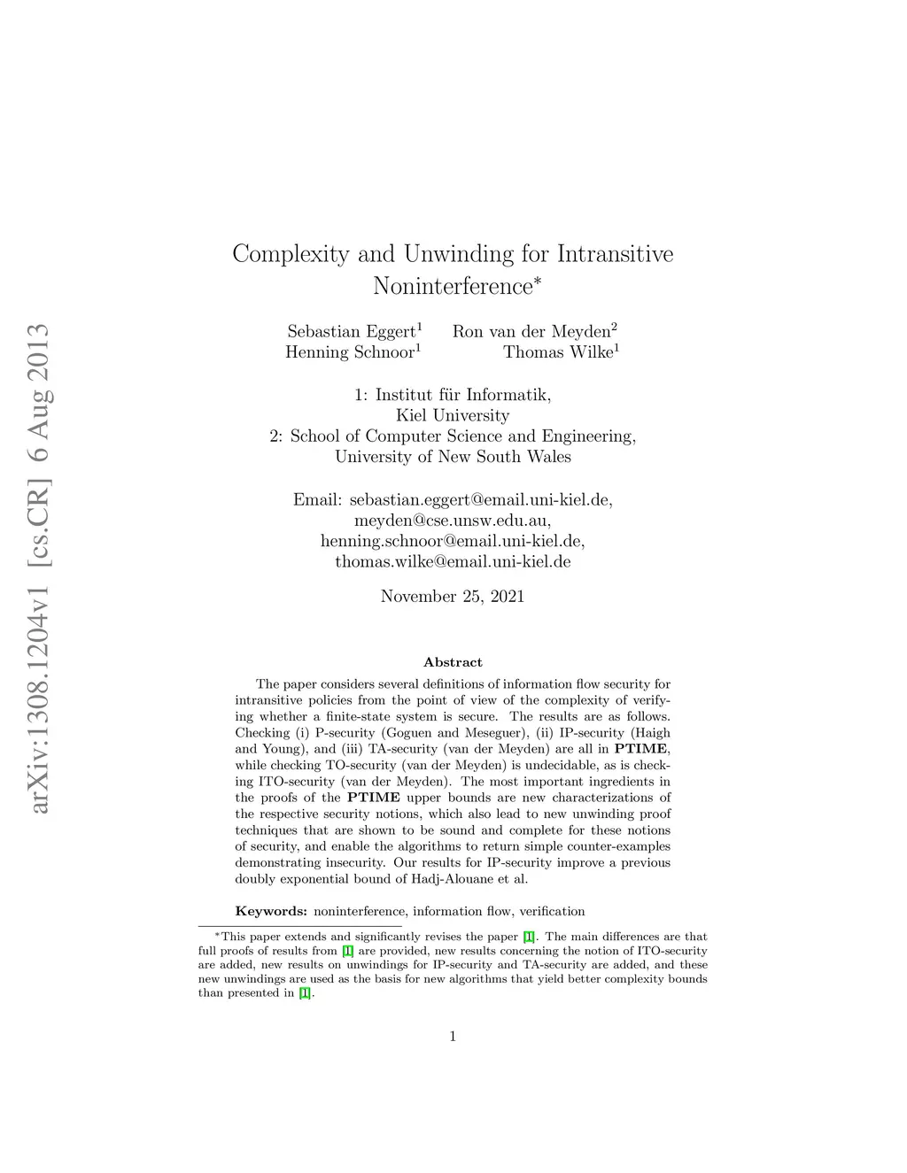 The paper considers several definitions of information flow security for intransitive policies from the point of view of the complexity of verifying whether a finite-state system is secure. The results are as follows. Checking (i) P-security (Goguen and Meseguer), (ii) IP-security (Haigh and Young), and (iii) TA-security (van der Meyden) are all in PTIME, while checking TO-security (van der Meyden) is undecidable, as is checking ITO-security (van der Meyden). The most important ingredients in the proofs of the PTIME upper bounds are new characterizations of the respective security notions, which also lead to new unwinding proof techniques that are shown to be sound and complete for these notions of security, and enable the algorithms to return simple counter-examples demonstrating insecurity. Our results for IP-security improve a previous doubly exponential bound of Hadj-Alouane et al.