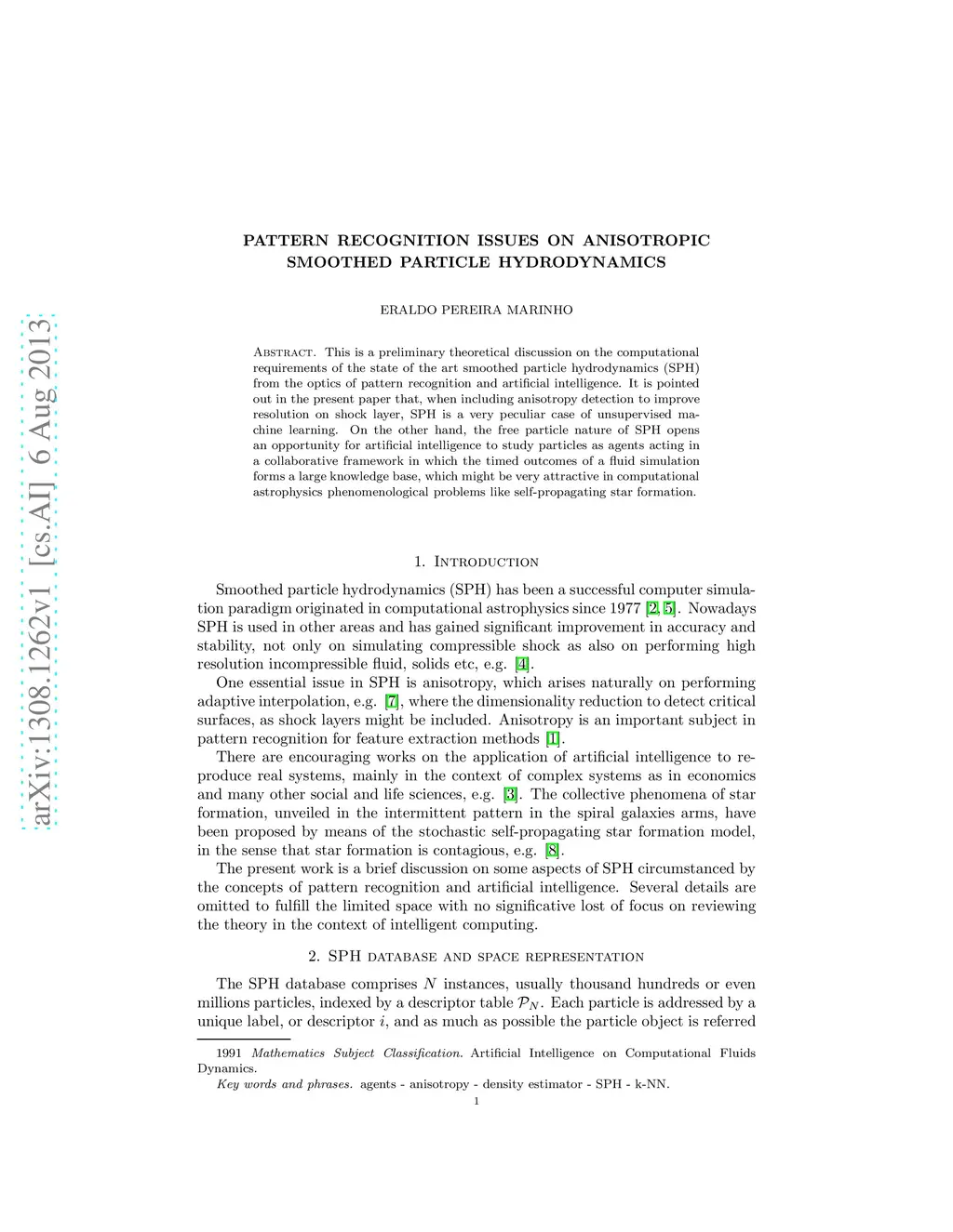 This is a preliminary theoretical discussion on the computational requirements of the state of the art smoothed particle hydrodynamics (SPH) from the optics of pattern recognition and artificial intelligence. It is pointed out in the present paper that, when including anisotropy detection to improve resolution on shock layer, SPH is a very peculiar case of unsupervised machine learning. On the other hand, the free particle nature of SPH opens an opportunity for artificial intelligence to study particles as agents acting in a collaborative framework in which the timed outcomes of a fluid simulation forms a large knowledge base, which might be very attractive in computational astrophysics phenomenological problems like self-propagating star formation.