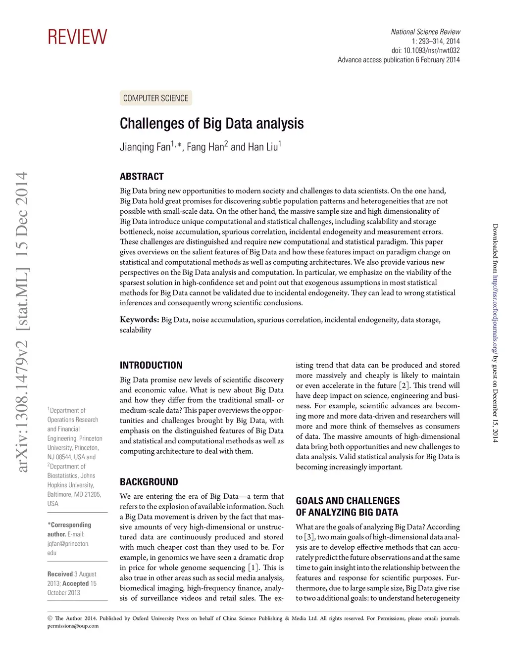 Big Data bring new opportunities to modern society and challenges to data scientists. On one hand, Big Data hold great promises for discovering subtle population patterns and heterogeneities that are not possible with small-scale data. On the other hand, the massive sample size and high dimensionality of Big Data introduce unique computational and statistical challenges, including scalability and storage bottleneck, noise accumulation, spurious correlation, incidental endogeneity, and measurement errors. These challenges are distinguished and require new computational and statistical paradigm. This article give overviews on the salient features of Big Data and how these features impact on paradigm change on statistical and computational methods as well as computing architectures. We also provide various new perspectives on the Big Data analysis and computation. In particular, we emphasis on the viability of the sparsest solution in high-confidence set and point out that exogeneous assumptions in most statistical methods for Big Data can not be validated due to incidental endogeneity. They can lead to wrong statistical inferences and consequently wrong scientific conclusions.