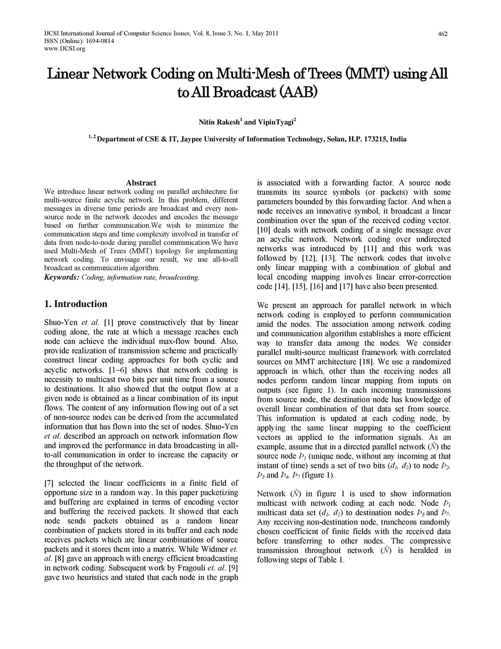 We introduce linear network coding on parallel architecture for multi-source finite acyclic network. In this problem, different messages in diverse time periods are broadcast and every nonsource node in the network decodes and encodes the message based on further communication.We wish to minimize the communication steps and time complexity involved in transfer of data from node-to-node during parallel communication.We have used Multi-Mesh of Trees (MMT) topology for implementing network coding. To envisage our result, we use all-to-all broadcast as communication algorithm.