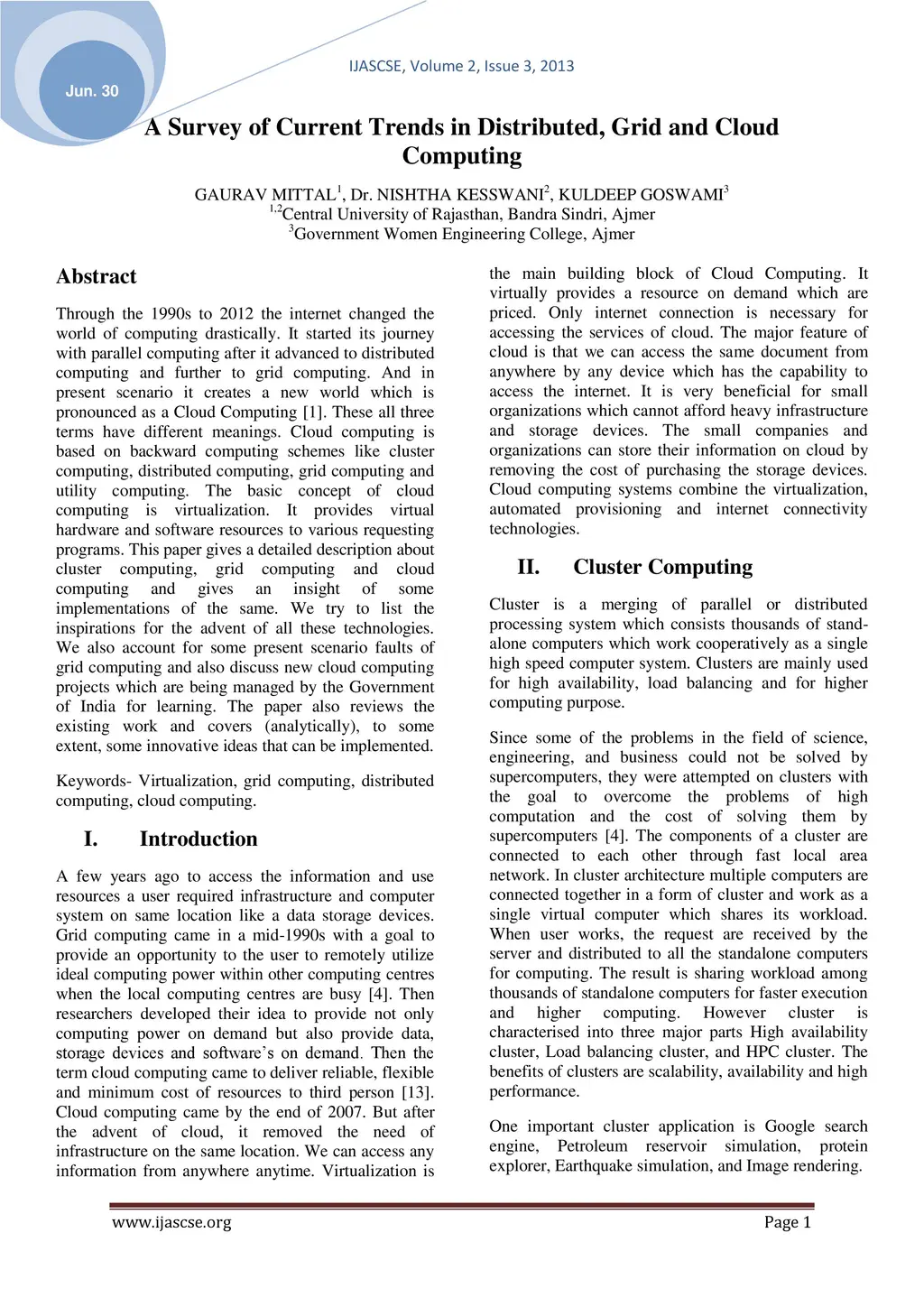 Through the 1990s to 2012 the internet changed the world of computing drastically. It started its journey with parallel computing after it advanced to distributed computing and further to grid computing. And in present scenario it creates a new world which is pronounced as a Cloud Computing [1]. These all three terms have different meanings. Cloud computing is based on backward computing schemes like cluster computing, distributed computing, grid computing and utility computing. The basic concept of cloud computing is virtualization. It provides virtual hardware and software resources to various requesting programs. This paper gives a detailed description about cluster computing, grid computing and cloud computing and gives an insight of some implementations of the same. We try to list the inspirations for the advent of all these technologies. We also account for some present scenario faults of grid computing and also discuss new cloud computing projects which are being managed by the Government of India for learning. The paper also reviews the existing work and covers (analytically), to some extent, some innovative ideas that can be implemented.