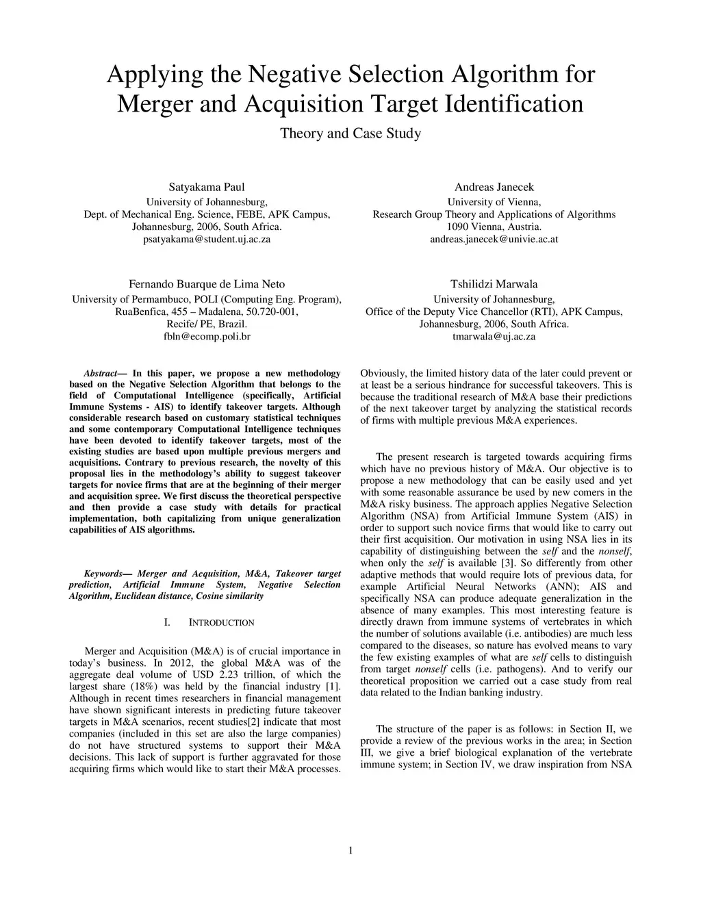 Applying the Negative Selection Algorithm for Merger and Acquisition