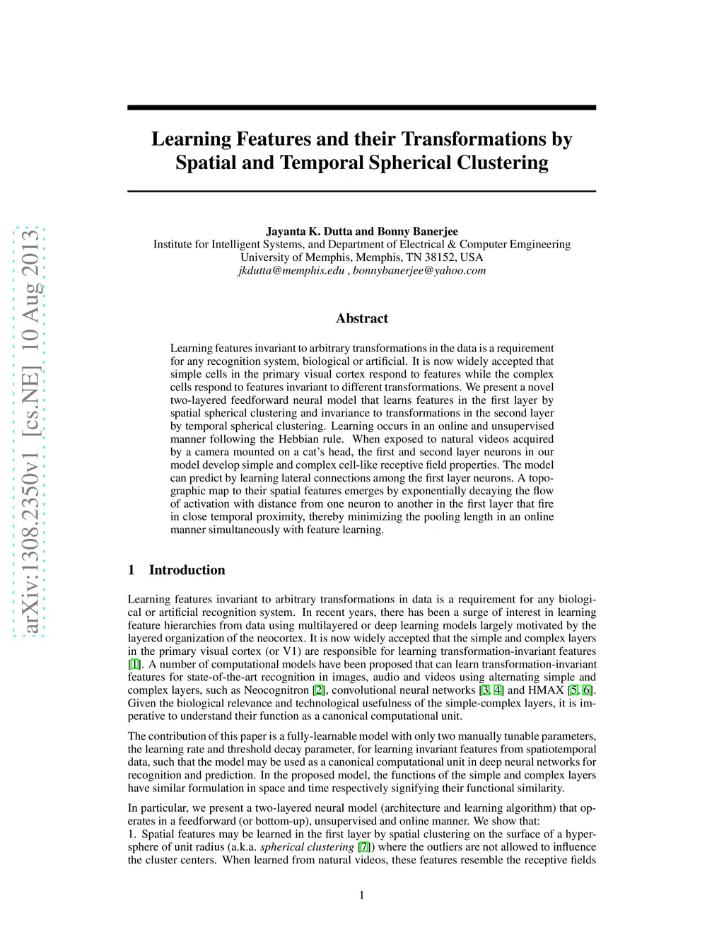 Learning features invariant to arbitrary transformations in the data is a requirement for any recognition system, biological or artificial. It is now widely accepted that simple cells in the primary visual cortex respond to features while the complex cells respond to features invariant to different transformations. We present a novel two-layered feedforward neural model that learns features in the first layer by spatial spherical clustering and invariance to transformations in the second layer by temporal spherical clustering. Learning occurs in an online and unsupervised manner following the Hebbian rule. When exposed to natural videos acquired by a camera mounted on a cat's head, the first and second layer neurons in our model develop simple and complex cell-like receptive field properties. The model can predict by learning lateral connections among the first layer neurons. A topographic map to their spatial features emerges by exponentially decaying the flow of activation with distance from one neuron to another in the first layer that fire in close temporal proximity, thereby minimizing the pooling length in an online manner simultaneously with feature learning.