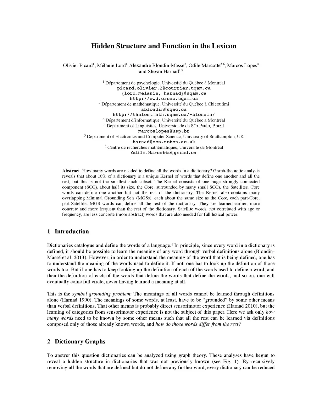 How many words are needed to define all the words in a dictionary? Graph-theoretic analysis reveals that about 10% of a dictionary is a unique Kernel of words that define one another and all the rest, but this is not the smallest such subset. The Kernel consists of one huge strongly connected component (SCC), about half its size, the Core, surrounded by many small SCCs, the Satellites. Core words can define one another but not the rest of the dictionary. The Kernel also contains many overlapping Minimal Grounding Sets (MGSs), each about the same size as the Core, each part-Core, part-Satellite. MGS words can define all the rest of the dictionary. They are learned earlier, more concrete and more frequent than the rest of the dictionary. Satellite words, not correlated with age or frequency, are less concrete (more abstract) words that are also needed for full lexical power.