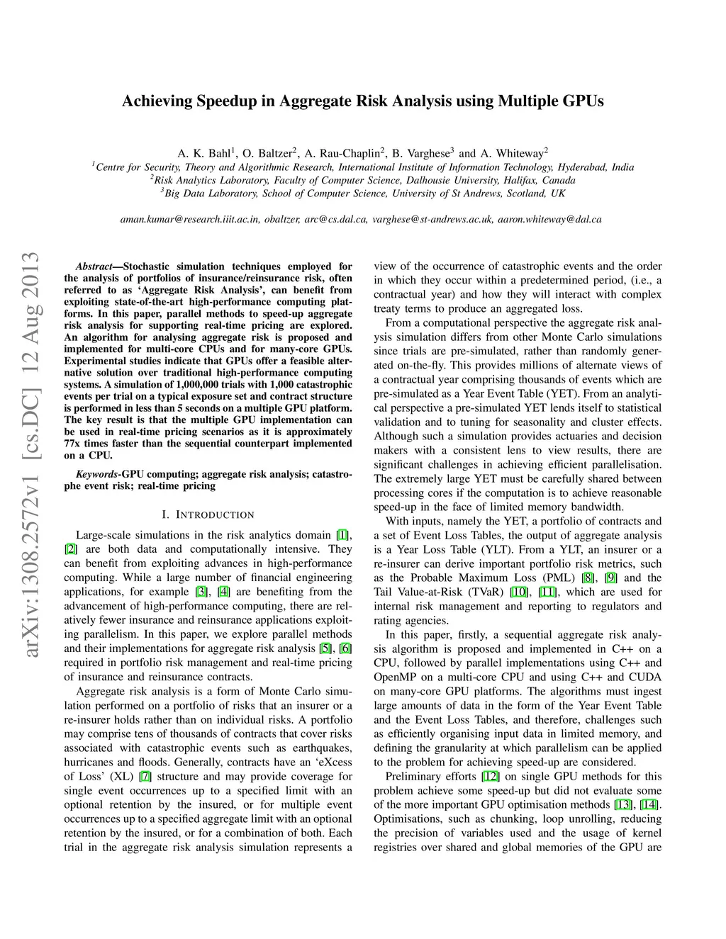 Achieving Speedup in Aggregate Risk Analysis using Multiple GPUs