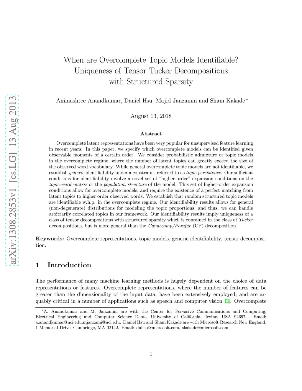 When are Overcomplete Topic Models Identifiable? Uniqueness of Tensor