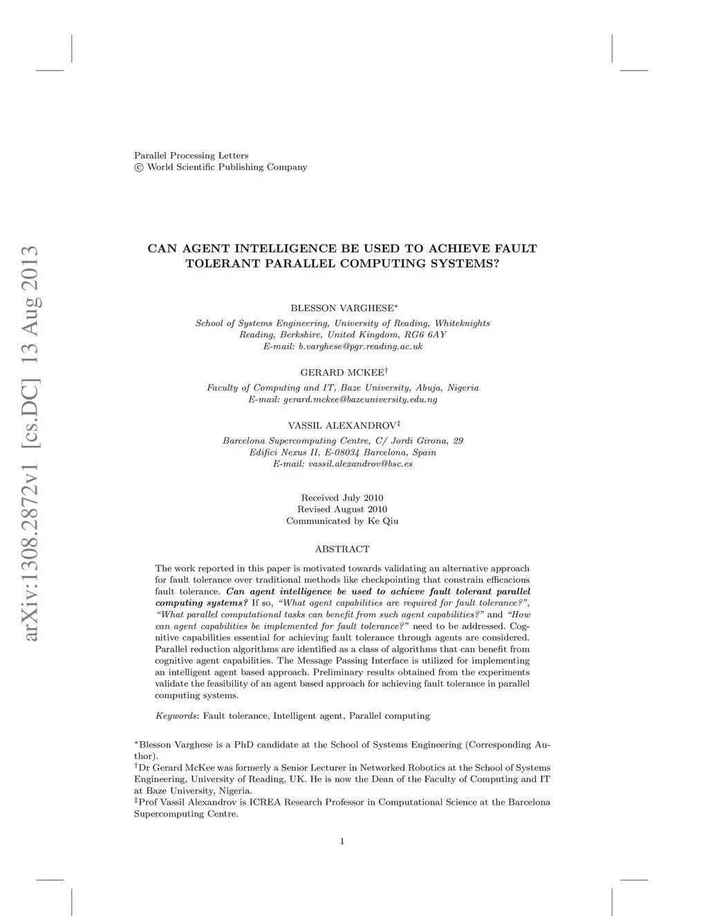 Can Agent Intelligence be used to Achieve Fault Tolerant Parallel
