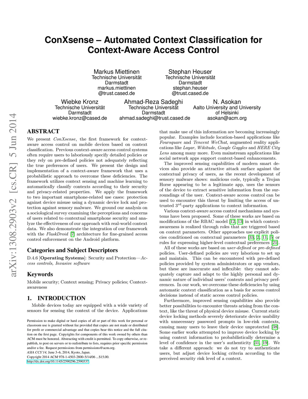We present ConXsense, the first framework for context-aware access control on mobile devices based on context classification. Previous context-aware access control systems often require users to laboriously specify detailed policies or they rely on pre-defined policies not adequately reflecting the true preferences of users. We present the design and implementation of a context-aware framework that uses a probabilistic approach to overcome these deficiencies. The framework utilizes context sensing and machine learning to automatically classify contexts according to their security and privacy-related properties. We apply the framework to two important smartphone-related use cases: protection against device misuse using a dynamic device lock and protection against sensory malware. We ground our analysis on a sociological survey examining the perceptions and concerns of users related to contextual smartphone security and analyze the effectiveness of our approach with real-world context data. We also demonstrate the integration of our framework with the FlaskDroid architecture for fine-grained access control enforcement on the Android platform.
