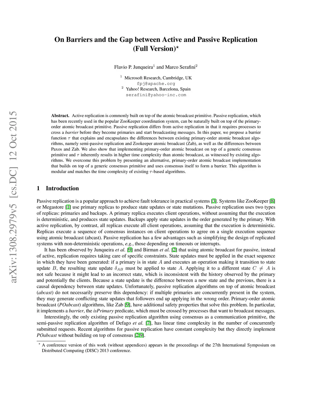 Active replication is commonly built on top of the atomic broadcast primitive. Passive replication, which has been recently used in the popular ZooKeeper coordination system, can be naturally built on top of the primary-order atomic broadcast primitive. Passive replication differs from active replication in that it requires processes to cross a barrier before they become primaries and start broadcasting messages. In this paper, we propose a barrier function tau that explains and encapsulates the differences between existing primary-order atomic broadcast algorithms, namely semi-passive replication and Zookeeper atomic broadcast (Zab), as well as the differences between Paxos and Zab. We also show that implementing primary-order atomic broadcast on top of a generic consensus primitive and tau inherently results in higher time complexity than atomic broadcast, as witnessed by existing algorithms. We overcome this problem by presenting an alternative, primary-order atomic broadcast implementation that builds on top of a generic consensus primitive and uses consensus itself to form a barrier. This algorithm is modular and matches the time complexity of existing tau-based algorithms.