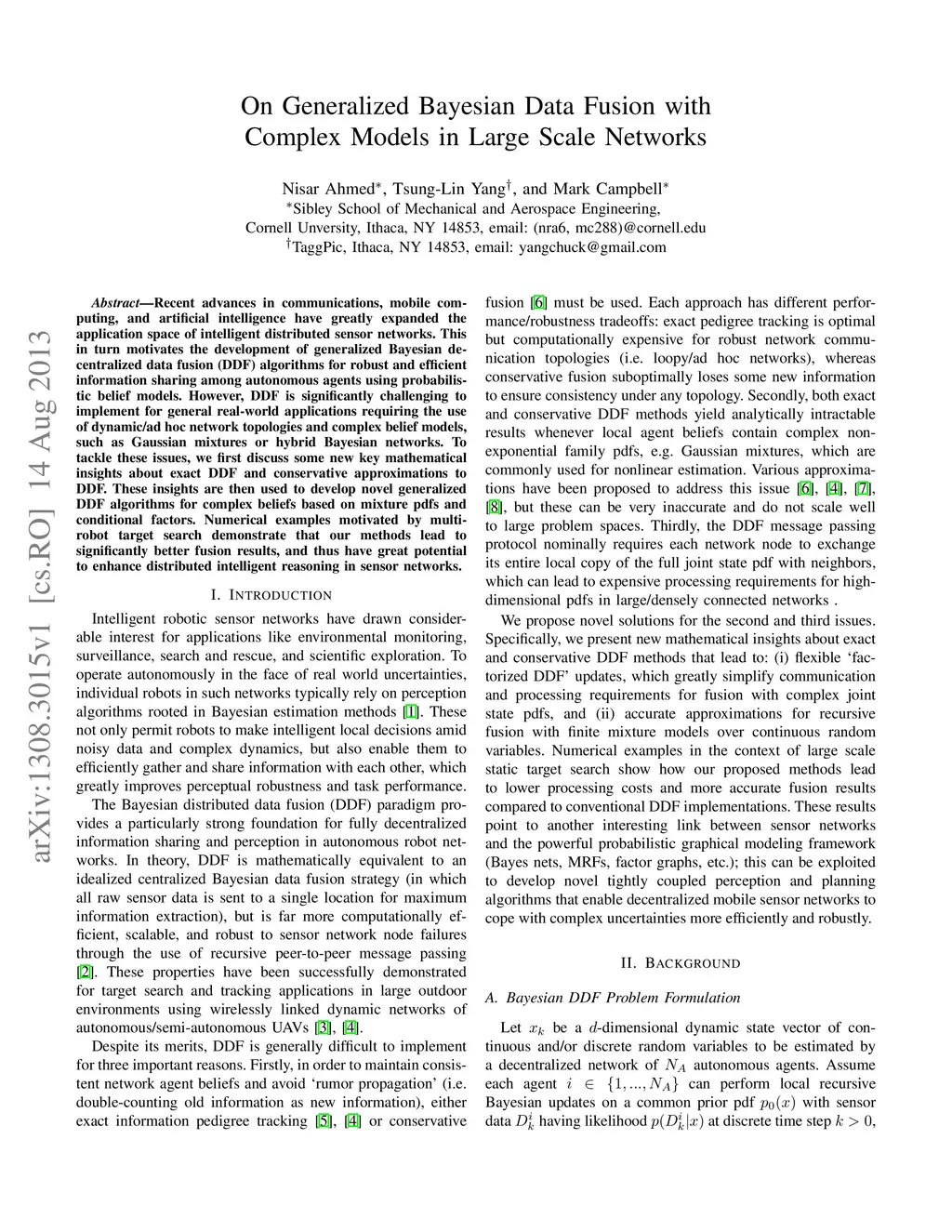 Recent advances in communications, mobile computing, and artificial intelligence have greatly expanded the application space of intelligent distributed sensor networks. This in turn motivates the development of generalized Bayesian decentralized data fusion (DDF) algorithms for robust and efficient information sharing among autonomous agents using probabilistic belief models. However, DDF is significantly challenging to implement for general real-world applications requiring the use of dynamic/ad hoc network topologies and complex belief models, such as Gaussian mixtures or hybrid Bayesian networks. To tackle these issues, we first discuss some new key mathematical insights about exact DDF and conservative approximations to DDF. These insights are then used to develop novel generalized DDF algorithms for complex beliefs based on mixture pdfs and conditional factors. Numerical examples motivated by multi-robot target search demonstrate that our methods lead to significantly better fusion results, and thus have great potential to enhance distributed intelligent reasoning in sensor networks.