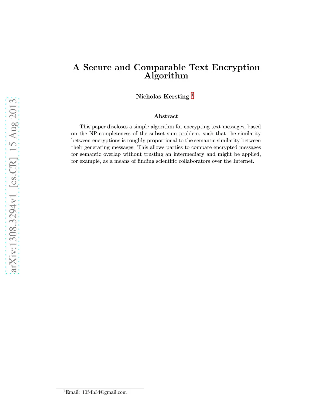 This paper discloses a simple algorithm for encrypting text messages, based on the NP-completeness of the subset sum problem, such that the similarity between encryptions is roughly proportional to the semantic similarity between their generating messages. This allows parties to compare encrypted messages for semantic overlap without trusting an intermediary and might be applied, for example, as a means of finding scientific collaborators over the Internet.