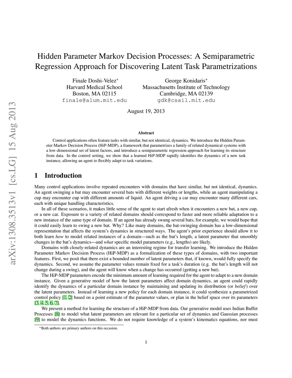 Control applications often feature tasks with similar, but not identical, dynamics. We introduce the Hidden Parameter Markov Decision Process (HiP-MDP), a framework that parametrizes a family of related dynamical systems with a low-dimensional set of latent factors, and introduce a semiparametric regression approach for learning its structure from data. In the control setting, we show that a learned HiP-MDP rapidly identifies the dynamics of a new task instance, allowing an agent to flexibly adapt to task variations.