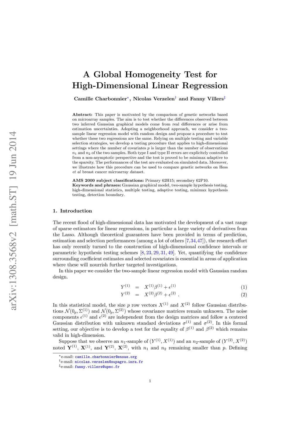 This paper is motivated by the comparison of genetic networks based on microarray samples. The aim is to test whether the differences observed between two inferred Gaussian graphical models come from real differences or arise from estimation uncertainties. Adopting a neighborhood approach, we consider a two-sample linear regression model with random design and propose a procedure to test whether these two regressions are the same. Relying on multiple testing and variable selection strategies, we develop a testing procedure that applies to high-dimensional settings where the number of covariates is larger than the number of observations and of the two samples. Both type I and type II errors are explicitely controlled from a non-asymptotic perspective and the test is proved to be minimax adaptive to the sparsity. The performances of the test are evaluated on simulated data. Moreover, we illustrate how this procedure can be used to compare genetic networks on Hess \emph{et al} breast cancer microarray dataset.