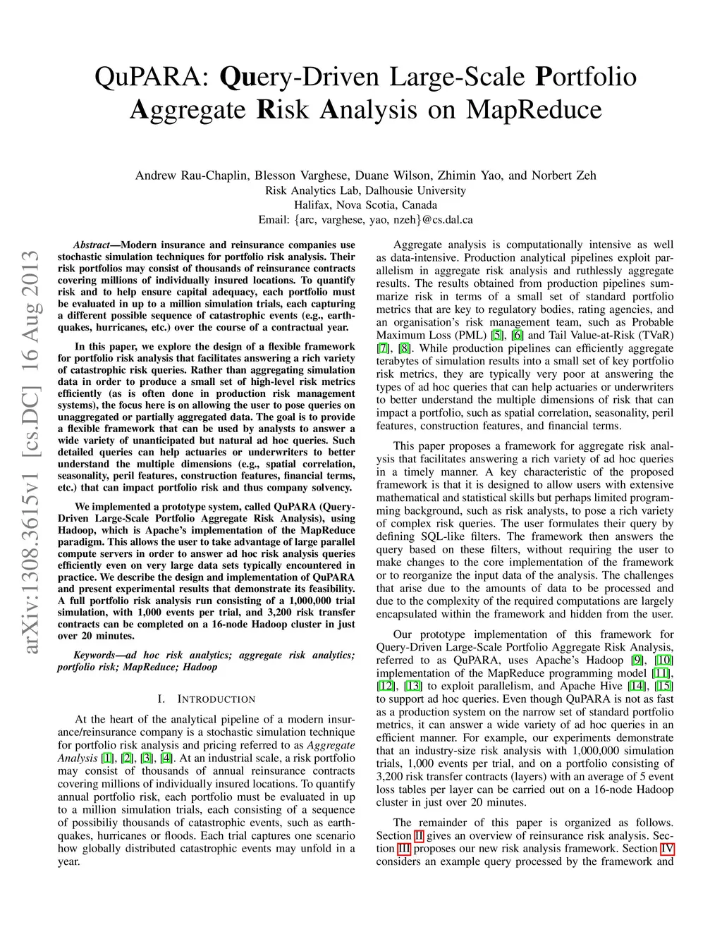 Stochastic simulation techniques are used for portfolio risk analysis. Risk portfolios may consist of thousands of reinsurance contracts covering millions of insured locations. To quantify risk each portfolio must be evaluated in up to a million simulation trials, each capturing a different possible sequence of catastrophic events over the course of a contractual year. In this paper, we explore the design of a flexible framework for portfolio risk analysis that facilitates answering a rich variety of catastrophic risk queries. Rather than aggregating simulation data in order to produce a small set of high-level risk metrics efficiently (as is often done in production risk management systems), the focus here is on allowing the user to pose queries on unaggregated or partially aggregated data. The goal is to provide a flexible framework that can be used by analysts to answer a wide variety of unanticipated but natural ad hoc queries. Such detailed queries can help actuaries or underwriters to better understand the multiple dimensions (e.g., spatial correlation, seasonality, peril features, construction features, and financial terms) that can impact portfolio risk. We implemented a prototype system, called QuPARA (Query-Driven Large-Scale Portfolio Aggregate Risk Analysis), using Hadoop, which is Apache's implementation of the MapReduce paradigm. This allows the user to take advantage of large parallel compute servers in order to answer ad hoc risk analysis queries efficiently even on very large data sets typically encountered in practice. We describe the design and implementation of QuPARA and present experimental results that demonstrate its feasibility. A full portfolio risk analysis run consisting of a 1,000,000 trial simulation, with 1,000 events per trial, and 3,200 risk transfer contracts can be completed on a 16-node Hadoop cluster in just over 20 minutes.