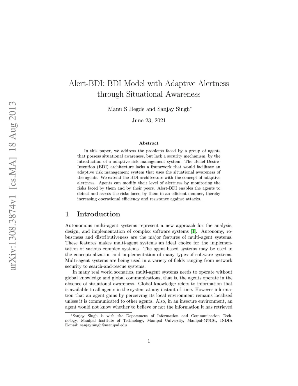 In this paper, we address the problems faced by a group of agents that possess situational awareness, but lack a security mechanism, by the introduction of a adaptive risk management system. The Belief-Desire-Intention (BDI) architecture lacks a framework that would facilitate an adaptive risk management system that uses the situational awareness of the agents. We extend the BDI architecture with the concept of adaptive alertness. Agents can modify their level of alertness by monitoring the risks faced by them and by their peers. Alert-BDI enables the agents to detect and assess the risks faced by them in an efficient manner, thereby increasing operational efficiency and resistance against attacks.