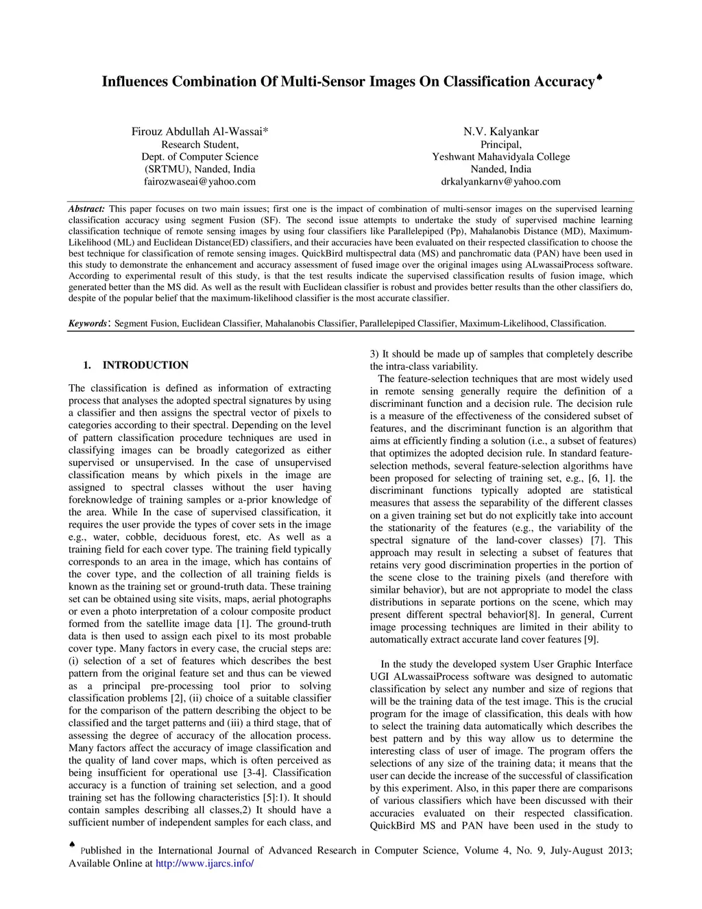 This paper focuses on two main issues; first one is the impact of combination of multi-sensor images on the supervised learning classification accuracy using segment Fusion (SF). The second issue attempts to undertake the study of supervised machine learning classification technique of remote sensing images by using four classifiers like Parallelepiped (Pp), Mahalanobis Distance (MD), Maximum-Likelihood (ML) and Euclidean Distance(ED) classifiers, and their accuracies have been evaluated on their respected classification to choose the best technique for classification of remote sensing images. QuickBird multispectral data (MS) and panchromatic data (PAN) have been used in this study to demonstrate the enhancement and accuracy assessment of fused image over the original images using ALwassaiProcess software. According to experimental result of this study, is that the test results indicate the supervised classification results of fusion image, which generated better than the MS did. As well as the result with Euclidean classifier is robust and provides better results than the other classifiers do, despite of the popular belief that the maximum-likelihood classifier is the most accurate classifier.