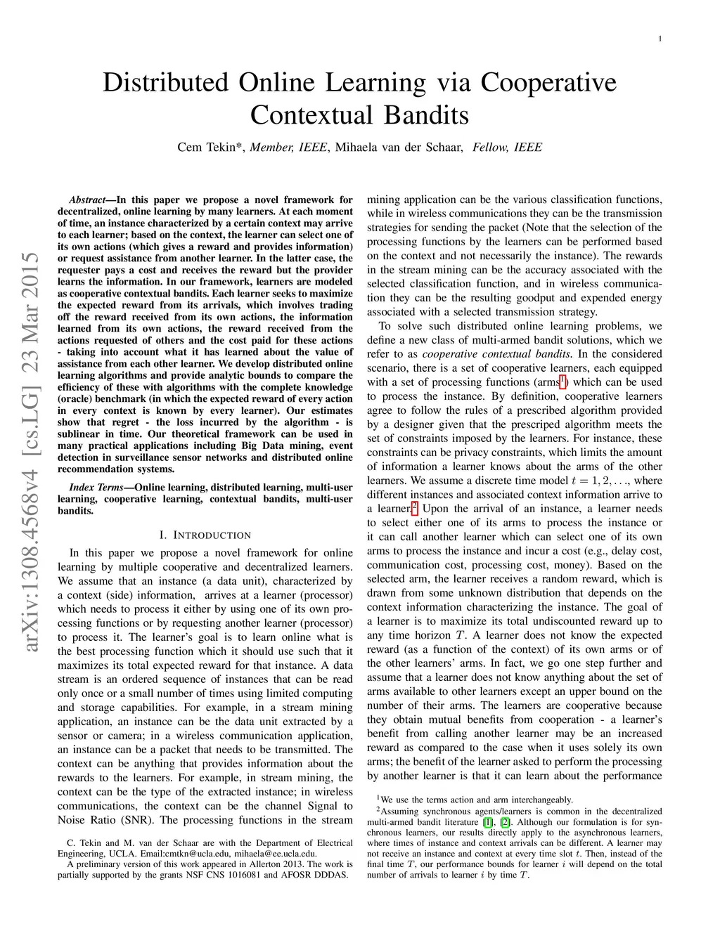 In this paper we propose a novel framework for decentralized, online learning by many learners. At each moment of time, an instance characterized by a certain context may arrive to each learner; based on the context, the learner can select one of its own actions (which gives a reward and provides information) or request assistance from another learner. In the latter case, the requester pays a cost and receives the reward but the provider learns the information. In our framework, learners are modeled as cooperative contextual bandits. Each learner seeks to maximize the expected reward from its arrivals, which involves trading off the reward received from its own actions, the information learned from its own actions, the reward received from the actions requested of others and the cost paid for these actions - taking into account what it has learned about the value of assistance from each other learner. We develop distributed online learning algorithms and provide analytic bounds to compare the efficiency of these with algorithms with the complete knowledge (oracle) benchmark (in which the expected reward of every action in every context is known by every learner). Our estimates show that regret - the loss incurred by the algorithm - is sublinear in time. Our theoretical framework can be used in many practical applications including Big Data mining, event detection in surveillance sensor networks and distributed online recommendation systems.