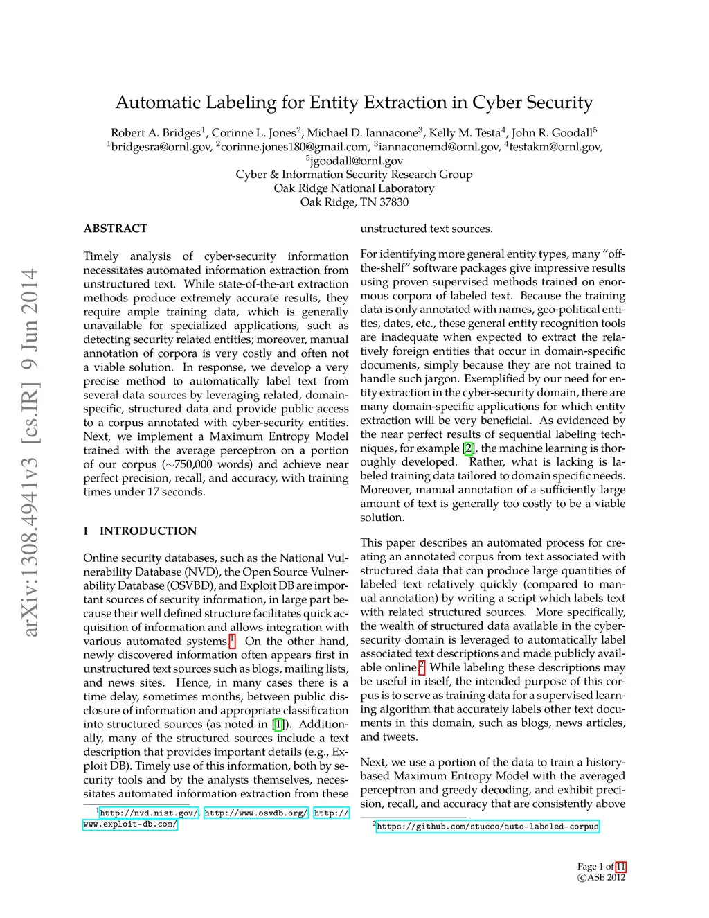 Timely analysis of cyber-security information necessitates automated information extraction from unstructured text. While state-of-the-art extraction methods produce extremely accurate results, they require ample training data, which is generally unavailable for specialized applications, such as detecting security related entities; moreover, manual annotation of corpora is very costly and often not a viable solution. In response, we develop a very precise method to automatically label text from several data sources by leveraging related, domain-specific, structured data and provide public access to a corpus annotated with cyber-security entities. Next, we implement a Maximum Entropy Model trained with the average perceptron on a portion of our corpus (750,000 words) and achieve near perfect precision, recall, and accuracy, with training times under 17 seconds.