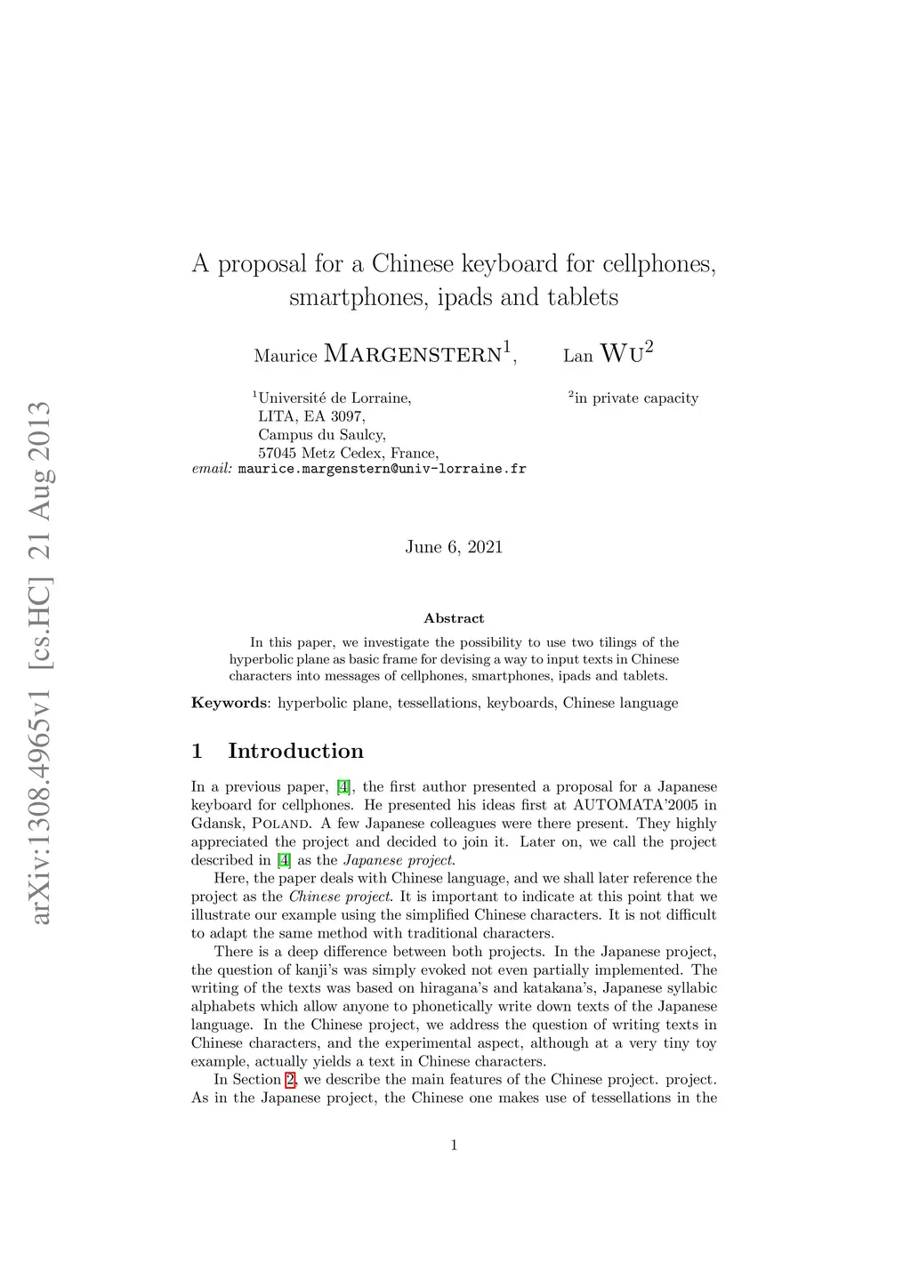 In this paper, we investigate the possibility to use two tilings of the hyperbolic plane as basic frame for devising a way to input texts in Chinese characters into messages of cellphones, smartphones, ipads and tablets.