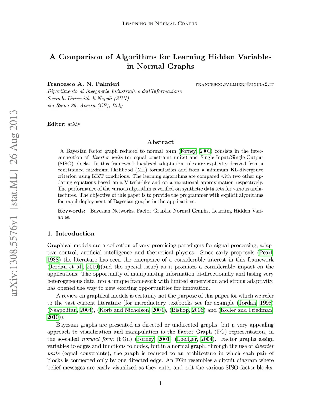 A Bayesian factor graph reduced to normal form consists in the interconnection of diverter units (or equal constraint units) and Single-Input/Single-Output (SISO) blocks. In this framework localized adaptation rules are explicitly derived from a constrained maximum likelihood (ML) formulation and from a minimum KL-divergence criterion using KKT conditions. The learning algorithms are compared with two other updating equations based on a Viterbi-like and on a variational approximation respectively. The performance of the various algorithm is verified on synthetic data sets for various architectures. The objective of this paper is to provide the programmer with explicit algorithms for rapid deployment of Bayesian graphs in the applications.