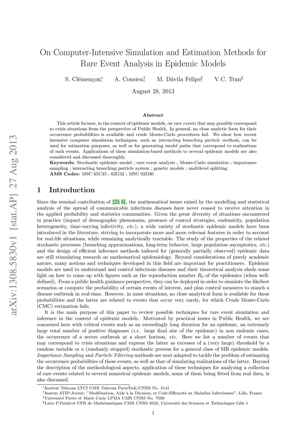 This article focuses, in the context of epidemic models, on rare events that may possibly correspond to crisis situations from the perspective of Public Health. In general, no close analytic form for their occurrence probabilities is available and crude Monte-Carlo procedures fail. We show how recent intensive computer simulation techniques, such as interacting branching particle methods, can be used for estimation purposes, as well as for generating model paths that correspond to realizations of such events. Applications of these simulation-based methods to several epidemic models are also considered and discussed thoroughly.