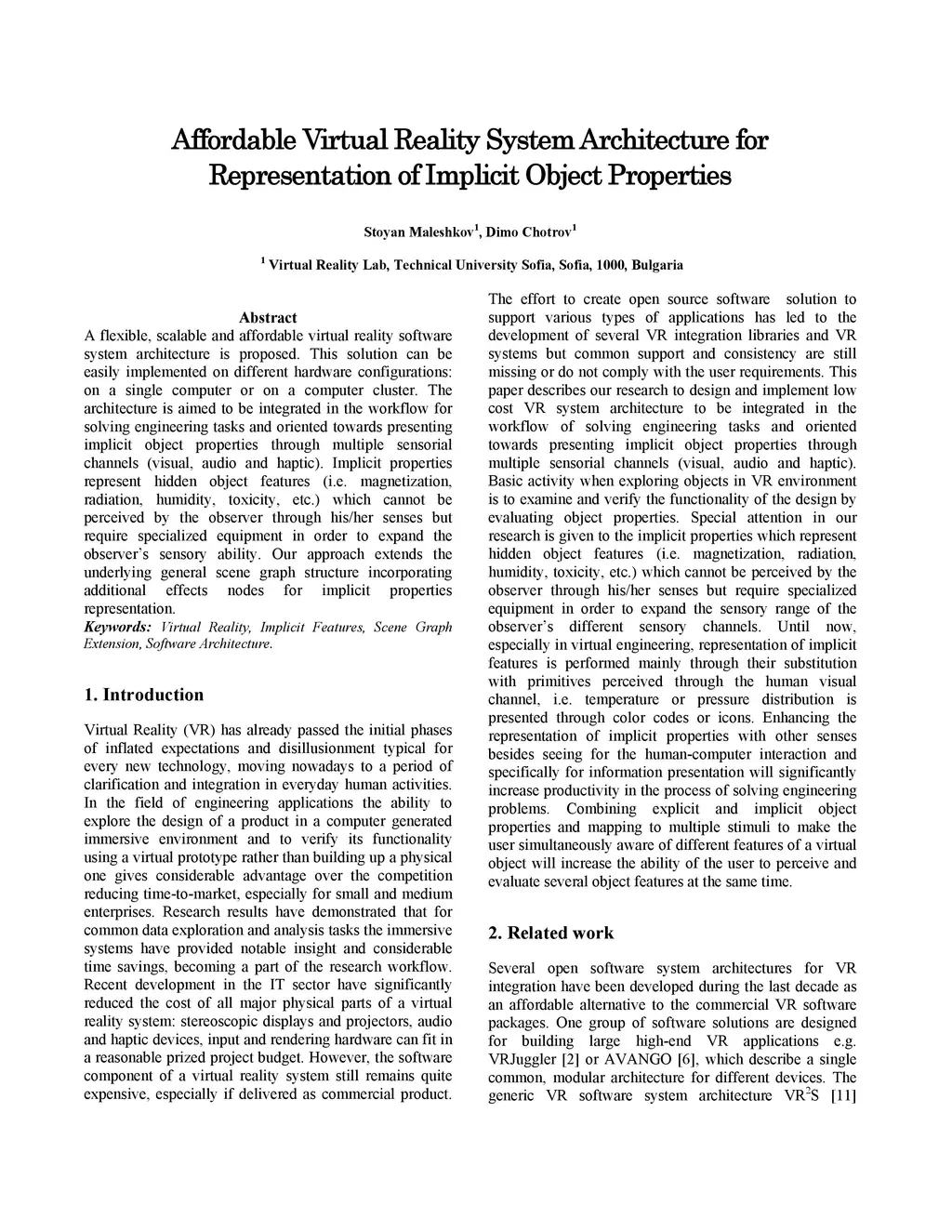 A flexible, scalable and affordable virtual reality software system architecture is proposed. This solution can be easily implemented on different hardware configurations: on a single computer or on a computer cluster. The architecture is aimed to be integrated in the workflow for solving engineering tasks and oriented towards presenting implicit object properties through multiple sensorial channels (visual, audio and haptic). Implicit properties represent hidden object features (i.e. magnetization, radiation, humidity, toxicity, etc.) which cannot be perceived by the observer through his or her senses but require specialized equipment in order to expand the sensory ability of the observer. Our approach extends the underlying general scene graph structure incorporating additional effects nodes for implicit properties representation.