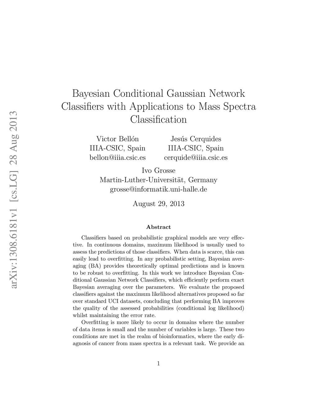 Classifiers based on probabilistic graphical models are very effective. In continuous domains, maximum likelihood is usually used to assess the predictions of those classifiers. When data is scarce, this can easily lead to overfitting. In any probabilistic setting, Bayesian averaging (BA) provides theoretically optimal predictions and is known to be robust to overfitting. In this work we introduce Bayesian Conditional Gaussian Network Classifiers, which efficiently perform exact Bayesian averaging over the parameters. We evaluate the proposed classifiers against the maximum likelihood alternatives proposed so far over standard UCI datasets, concluding that performing BA improves the quality of the assessed probabilities (conditional log likelihood) whilst maintaining the error rate. Overfitting is more likely to occur in domains where the number of data items is small and the number of variables is large. These two conditions are met in the realm of bioinformatics, where the early diagnosis of cancer from mass spectra is a relevant task. We provide an application of our classification framework to that problem, comparing it with the standard maximum likelihood alternative, where the improvement of quality in the assessed probabilities is confirmed.