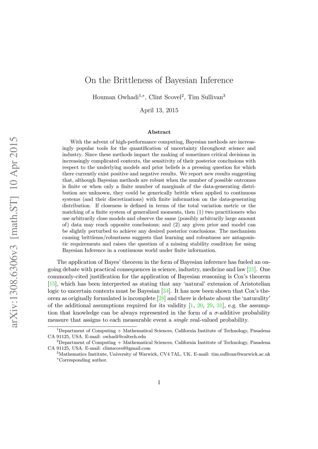With the advent of high-performance computing, Bayesian methods are increasingly popular tools for the quantification of uncertainty throughout science and industry. Since these methods impact the making of sometimes critical decisions in increasingly complicated contexts, the sensitivity of their posterior conclusions with respect to the underlying models and prior beliefs is a pressing question for which there currently exist positive and negative results. We report new results suggesting that, although Bayesian methods are robust when the number of possible outcomes is finite or when only a finite number of marginals of the data-generating distribution are unknown, they could be generically brittle when applied to continuous systems (and their discretizations) with finite information on the data-generating distribution. If closeness is defined in terms of the total variation metric or the matching of a finite system of generalized moments, then (1) two practitioners who use arbitrarily close models and observe the same (possibly arbitrarily large amount of) data may reach opposite conclusions; and (2) any given prior and model can be slightly perturbed to achieve any desired posterior conclusions. The mechanism causing brittlenss/robustness suggests that learning and robustness are antagonistic requirements and raises the question of a missing stability condition for using Bayesian Inference in a continuous world under finite information.