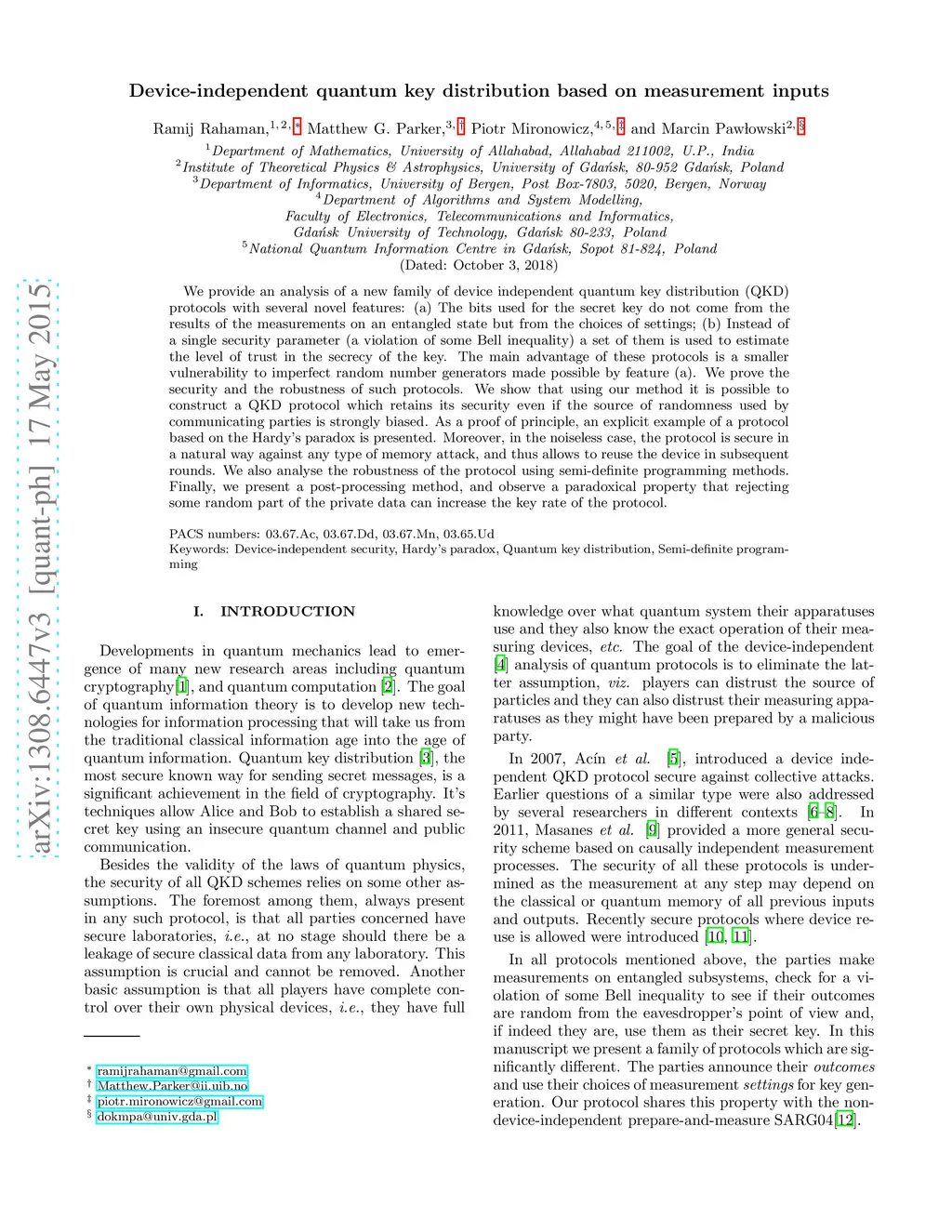 We provide an analysis of a new family of device independent quantum key distribution (QKD) protocols with several novel features: (a) The bits used for the secret key do not come from the results of the measurements on an entangled state but from the choices of settings; (b) Instead of a single security parameter (a violation of some Bell inequality) a set of them is used to estimate the level of trust in the secrecy of the key. The main advantage of these protocols is a smaller vulnerability to imperfect random number generators made possible by feature (a). We prove the security and the robustness of such protocols. We show that using our method it is possible to construct a QKD protocol which retains its security even if the source of randomness used by communicating parties is strongly biased. As a proof of principle, an explicit example of a protocol based on the Hardy's paradox is presented. Moreover, in the noiseless case, the protocol is secure in a natural way against any type of memory attack, and thus allows to reuse the device in subsequent rounds. We also analyse the robustness of the protocol using semi-definite programming methods. Finally, we present a post-processing method, and observe a paradoxical property that rejecting some random part of the private data can increase the key rate of the protocol.