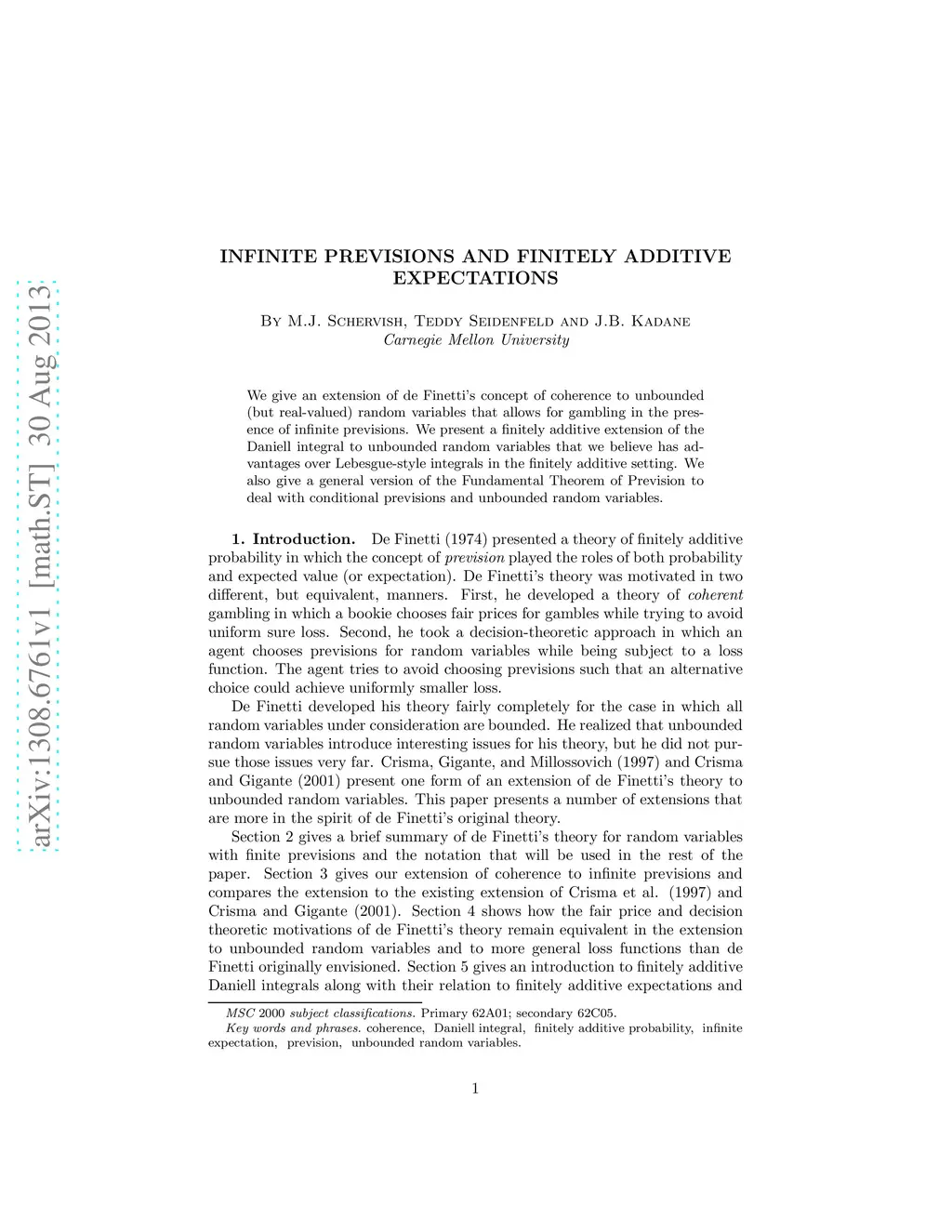 Infinite Previsions and Finitely Additive Expectations