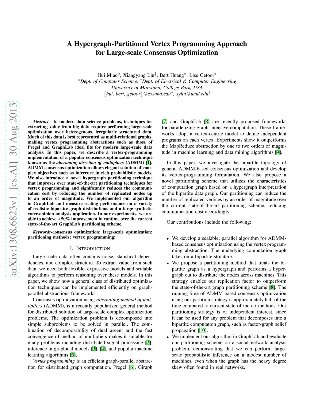 In modern data science problems, techniques for extracting value from big data require performing large-scale optimization over heterogenous, irregularly structured data. Much of this data is best represented as multi-relational graphs, making vertex programming abstractions such as those of Pregel and GraphLab ideal fits for modern large-scale data analysis. In this paper, we describe a vertex-programming implementation of a popular consensus optimization technique known as the alternating direction of multipliers (ADMM). ADMM consensus optimization allows elegant solution of complex objectives such as inference in rich probabilistic models. We also introduce a novel hypergraph partitioning technique that improves over state-of-the-art partitioning techniques for vertex programming and significantly reduces the communication cost by reducing the number of replicated nodes up to an order of magnitude. We implemented our algorithm in GraphLab and measure scaling performance on a variety of realistic bipartite graph distributions and a large synthetic voter-opinion analysis application. In our experiments, we are able to achieve a 50% improvement in runtime over the current state-of-the-art GraphLab partitioning scheme.