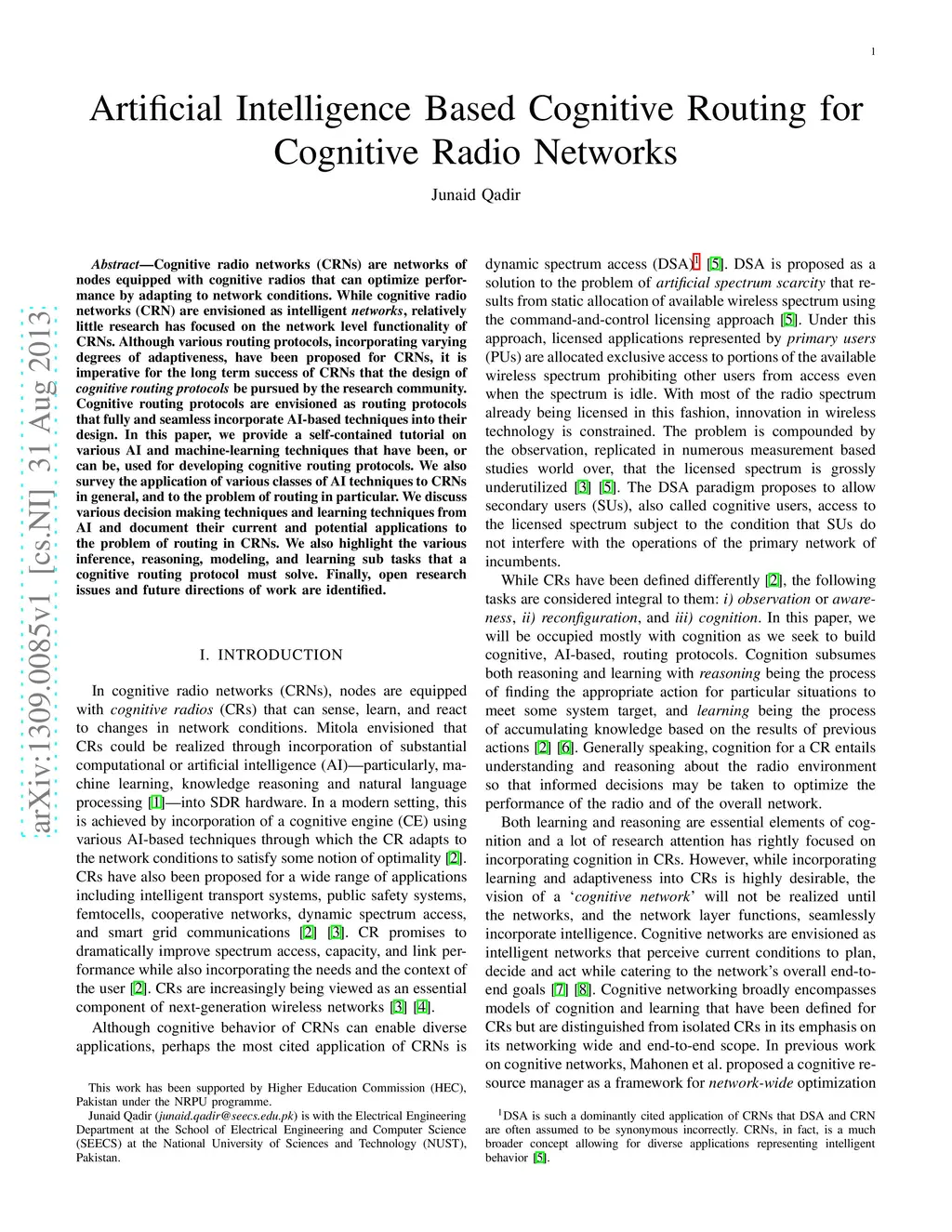 Artificial Intelligence Based Cognitive Routing for Cognitive Radio