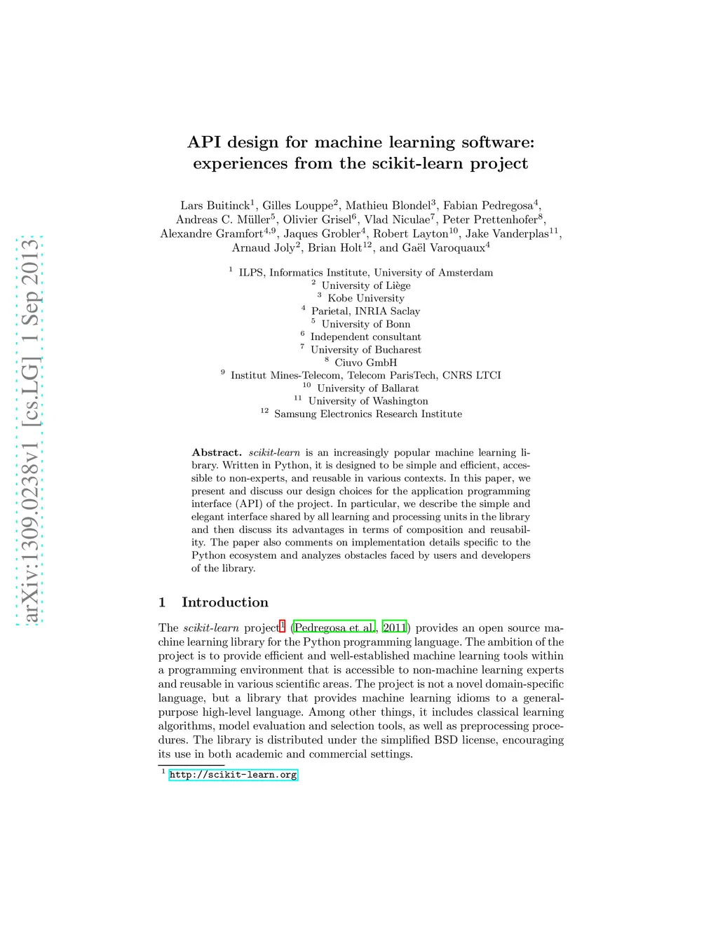 Scikit-learn is an increasingly popular machine learning li- brary. Written in Python, it is designed to be simple and efficient, accessible to non-experts, and reusable in various contexts. In this paper, we present and discuss our design choices for the application programming interface (API) of the project. In particular, we describe the simple and elegant interface shared by all learning and processing units in the library and then discuss its advantages in terms of composition and reusability. The paper also comments on implementation details specific to the Python ecosystem and analyzes obstacles faced by users and developers of the library.