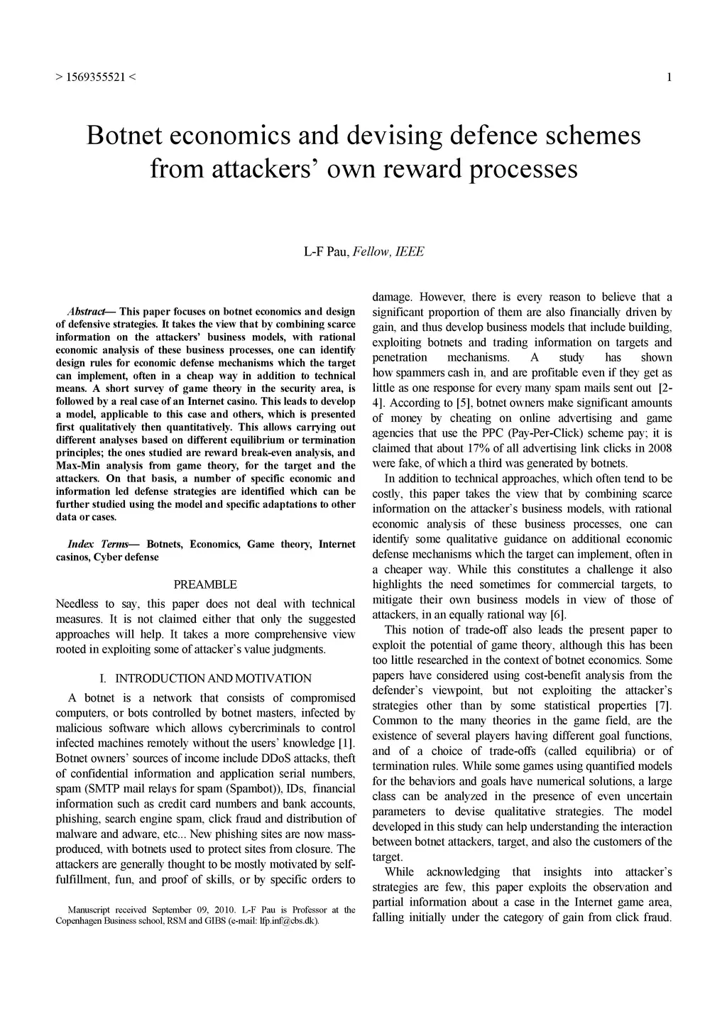 This paper focuses on botnet economics and design of defensive strategies. It takes the view that by combining scarce information on the attackers business models, with rational economic analysis of these business processes, one can identify design rules for economic defense mechanisms which the target can implement, often in a cheap way in addition to technical means. A short survey of game theory in the security area, is followed by a real case of an Internet casino. This leads to develop a model, applicable to this case and others, which is presented first qualitatively then quantitatively. This allows carrying out different analyses based on different equilibrium or termination principles; the ones studied are reward break-even analysis, and Max-Min analysis from game theory, for the target and the attackers. On that basis, a number of specific economic and information led defense strategies are identified which can be further studied using the model and specific adaptations to other data or cases.