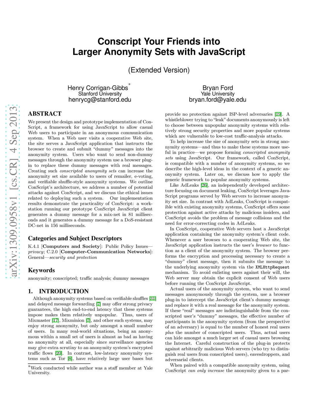 We present the design and prototype implementation of ConScript, a framework for using JavaScript to allow casual Web users to participate in an anonymous communication system. When a Web user visits a cooperative Web site, the site serves a JavaScript application that instructs the browser to create and submit "dummy" messages into the anonymity system. Users who want to send non-dummy messages through the anonymity system use a browser plug-in to replace these dummy messages with real messages. Creating such conscripted anonymity sets can increase the anonymity set size available to users of remailer, e-voting, and verifiable shuffle-style anonymity systems. We outline ConScript's architecture, we address a number of potential attacks against ConScript, and we discuss the ethical issues related to deploying such a system. Our implementation results demonstrate the practicality of ConScript: a workstation running our ConScript prototype JavaScript client generates a dummy message for a mix-net in 81 milliseconds and it generates a dummy message for a DoS-resistant DC-net in 156 milliseconds.