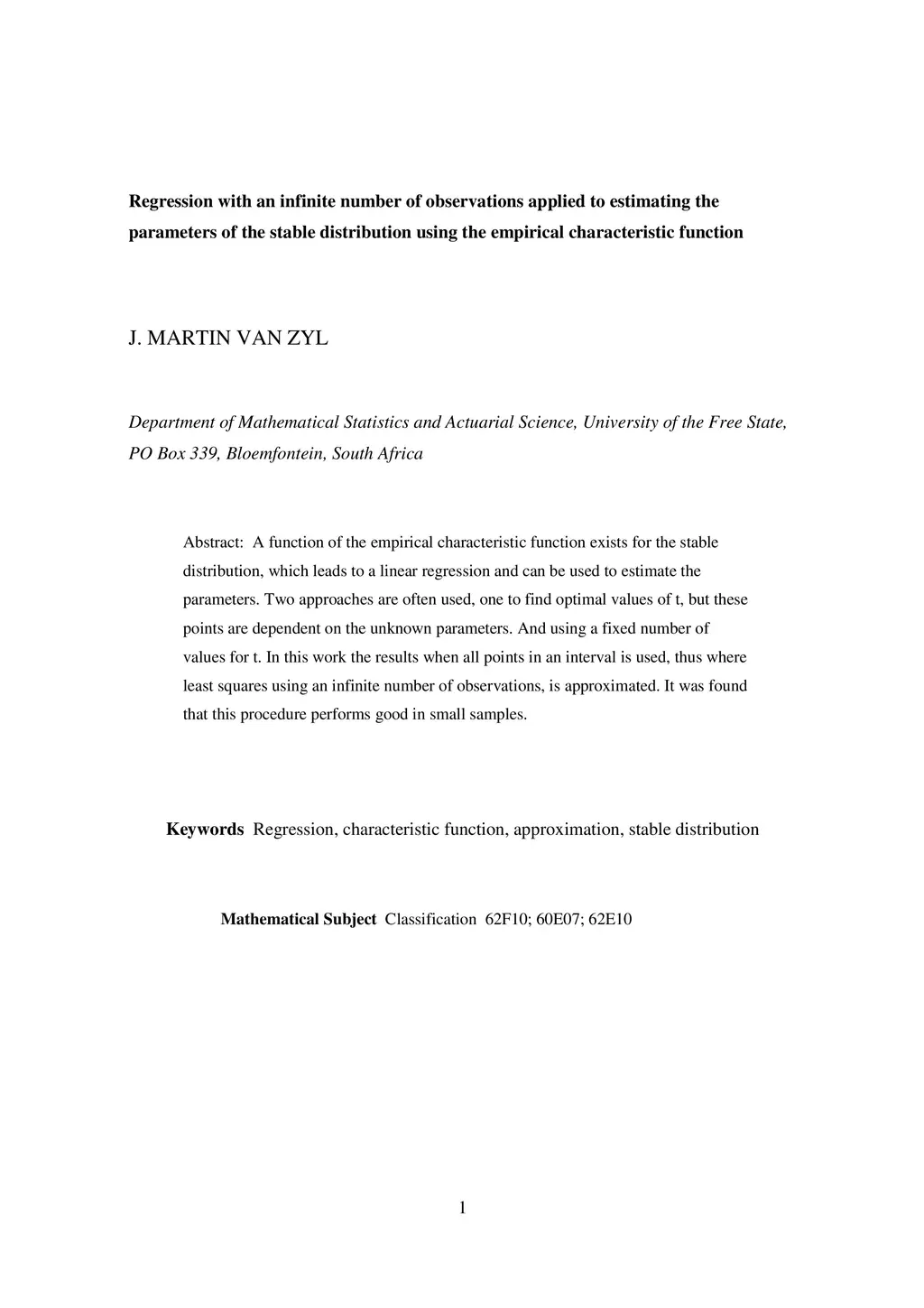 A function of the empirical characteristic function,exists for the stable distribution, which leads to a linear regression and can be used to estimate the parameters. Two approaches are often used, one to find optimal values of t, but these points are dependent on the unknown parameters. And using a fixed number of values for t. In this work the results when all points in an interval is used, thus where least squares using an infinite number of observations,is approximated. It was found that this procedure performs good in small samples.