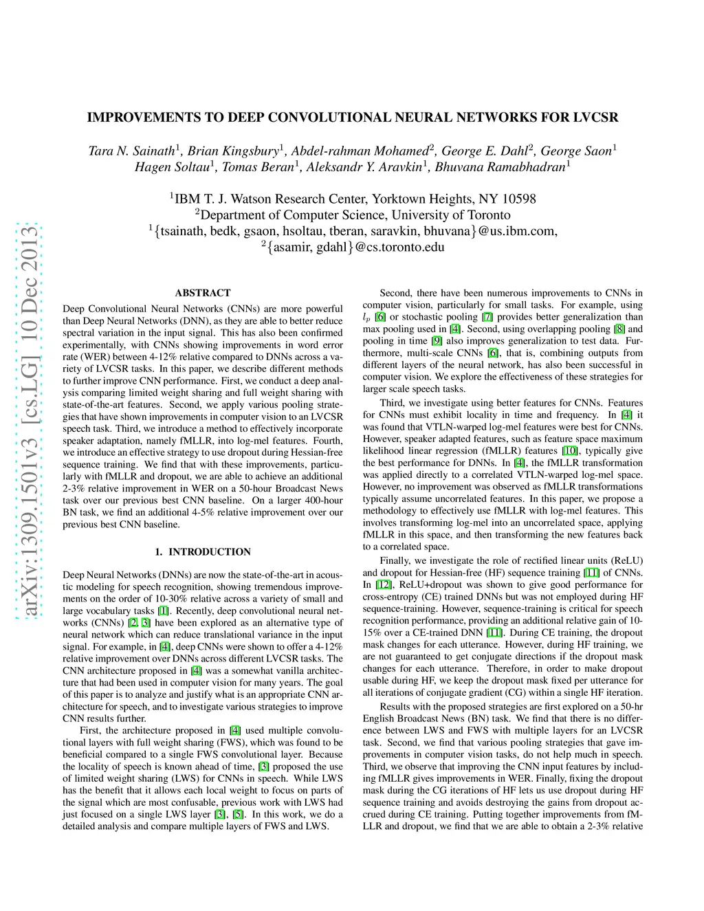 Deep Convolutional Neural Networks (CNNs) are more powerful than Deep Neural Networks (DNN), as they are able to better reduce spectral variation in the input signal. This has also been confirmed experimentally, with CNNs showing improvements in word error rate (WER) between 4-12% relative compared to DNNs across a variety of LVCSR tasks. In this paper, we describe different methods to further improve CNN performance. First, we conduct a deep analysis comparing limited weight sharing and full weight sharing with state-of-the-art features. Second, we apply various pooling strategies that have shown improvements in computer vision to an LVCSR speech task. Third, we introduce a method to effectively incorporate speaker adaptation, namely fMLLR, into log-mel features. Fourth, we introduce an effective strategy to use dropout during Hessian-free sequence training. We find that with these improvements, particularly with fMLLR and dropout, we are able to achieve an additional 2-3% relative improvement in WER on a 50-hour Broadcast News task over our previous best CNN baseline. On a larger 400-hour BN task, we find an additional 4-5% relative improvement over our previous best CNN baseline.