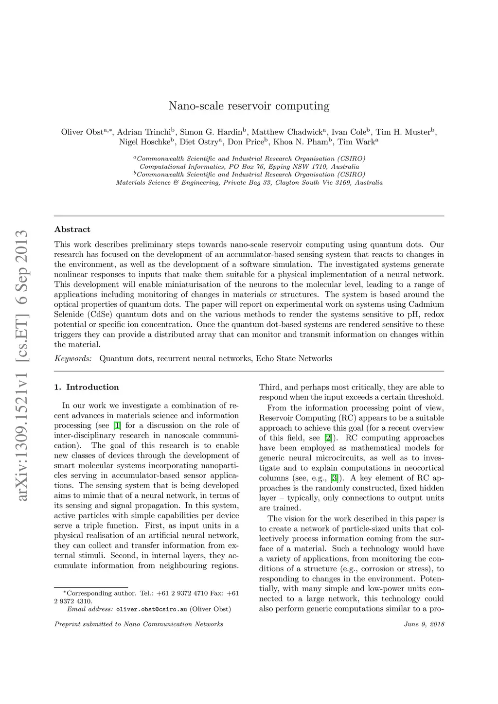 This work describes preliminary steps towards nano-scale reservoir computing using quantum dots. Our research has focused on the development of an accumulator-based sensing system that reacts to changes in the environment, as well as the development of a software simulation. The investigated systems generate nonlinear responses to inputs that make them suitable for a physical implementation of a neural network. This development will enable miniaturisation of the neurons to the molecular level, leading to a range of applications including monitoring of changes in materials or structures. The system is based around the optical properties of quantum dots. The paper will report on experimental work on systems using Cadmium Selenide (CdSe) quantum dots and on the various methods to render the systems sensitive to pH, redox potential or specific ion concentration. Once the quantum dot-based systems are rendered sensitive to these triggers they can provide a distributed array that can monitor and transmit information on changes within the material.
