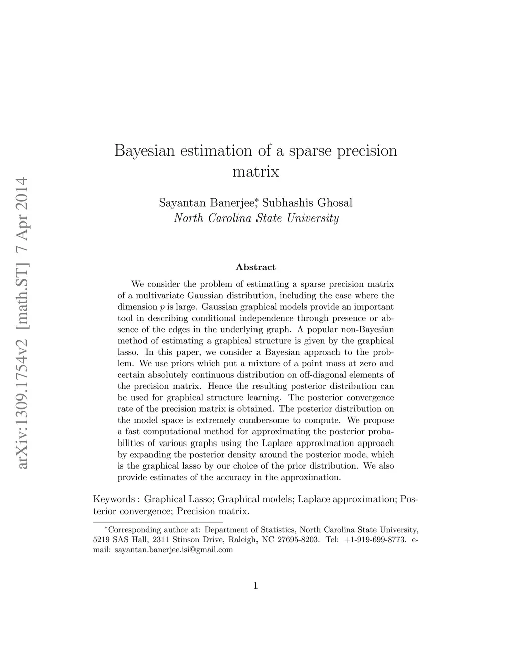 We consider the problem of estimating a sparse precision matrix of a multivariate Gaussian distribution, including the case where the dimension is large. Gaussian graphical models provide an important tool in describing conditional independence through presence or absence of the edges in the underlying graph. A popular non-Bayesian method of estimating a graphical structure is given by the graphical lasso. In this paper, we consider a Bayesian approach to the problem. We use priors which put a mixture of a point mass at zero and certain absolutely continuous distribution on off-diagonal elements of the precision matrix. Hence the resulting posterior distribution can be used for graphical structure learning. The posterior convergence rate of the precision matrix is obtained. The posterior distribution on the model space is extremely cumbersome to compute. We propose a fast computational method for approximating the posterior probabilities of various graphs using the Laplace approximation approach by expanding the posterior density around the posterior mode, which is the graphical lasso by our choice of the prior distribution. We also provide estimates of the accuracy in the approximation.