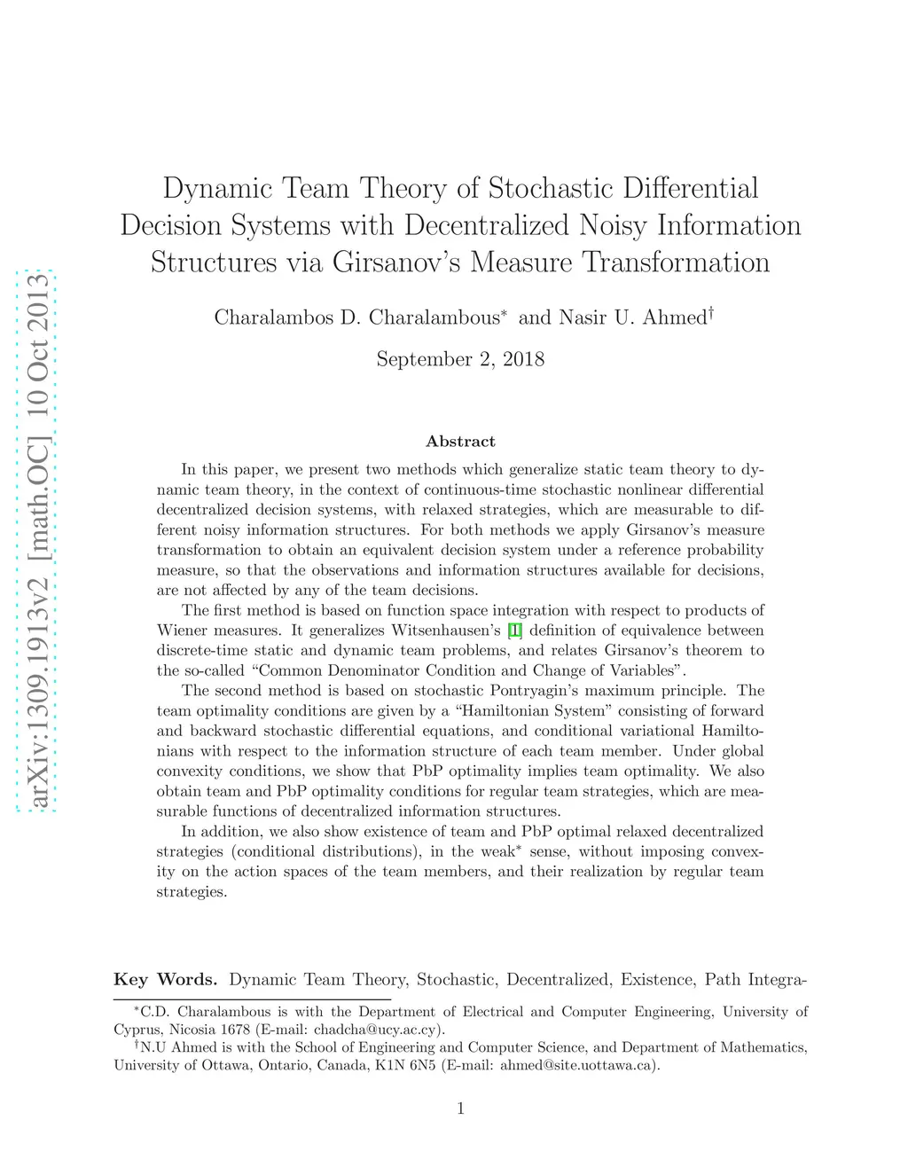 In this paper, we present two methods which generalize static team theory to dynamic team theory, in the context of continuous-time stochastic nonlinear differential decentralized decision systems, with relaxed strategies, which are measurable to different noisy information structures. For both methods we apply Girsanov's measure transformation to obtain an equivalent dynamic team problem under a reference probability measure, so that the observations and information structures available for decisions, are not affected by any of the team decisions. The first method is based on function space integration with respect to products of Wiener measures, and generalizes Witsenhausen's [1] definition of equivalence between discrete-time static and dynamic team problems. The second method is based on stochastic Pontryagin's maximum principle. The team optimality conditions are given by a "Hamiltonian System" consisting of forward and backward stochastic differential equations, and a conditional variational Hamiltonian with respect to the information structure of each team member, expressed under the initial and a reference probability space via Girsanov's measure transformation. Under global convexity conditions, we show that that PbP optimality implies team optimality. In addition, we also show existence of team and PbP optimal relaxed decentralized strategies (conditional distributions), in the weak sense, without imposing convexity on the action spaces of the team members. Moreover, using the embedding of regular strategies into relaxed strategies, we also obtain team and PbP optimality conditions for regular team strategies, which are measurable functions of decentralized information structures, and we use the Krein-Millman theorem to show realizability of relaxed strategies by regular strategies.