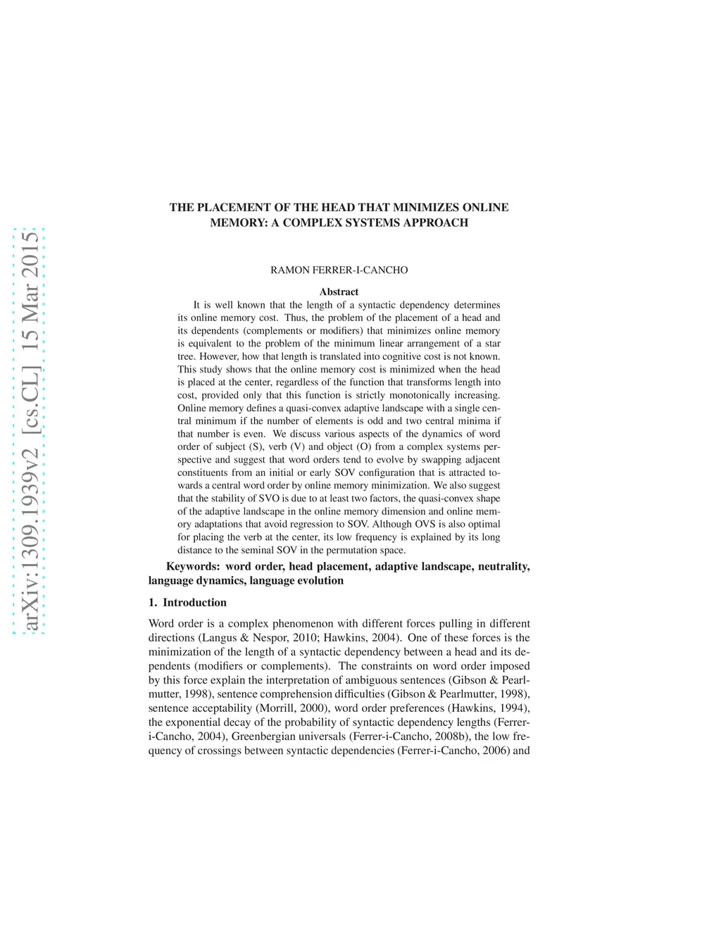 It is well known that the length of a syntactic dependency determines its online memory cost. Thus, the problem of the placement of a head and its dependents (complements or modifiers) that minimizes online memory is equivalent to the problem of the minimum linear arrangement of a star tree. However, how that length is translated into cognitive cost is not known. This study shows that the online memory cost is minimized when the head is placed at the center, regardless of the function that transforms length into cost, provided only that this function is strictly monotonically increasing. Online memory defines a quasi-convex adaptive landscape with a single central minimum if the number of elements is odd and two central minima if that number is even. We discuss various aspects of the dynamics of word order of subject (S), verb (V) and object (O) from a complex systems perspective and suggest that word orders tend to evolve by swapping adjacent constituents from an initial or early SOV configuration that is attracted towards a central word order by online memory minimization. We also suggest that the stability of SVO is due to at least two factors, the quasi-convex shape of the adaptive landscape in the online memory dimension and online memory adaptations that avoid regression to SOV. Although OVS is also optimal for placing the verb at the center, its low frequency is explained by its long distance to the seminal SOV in the permutation space.