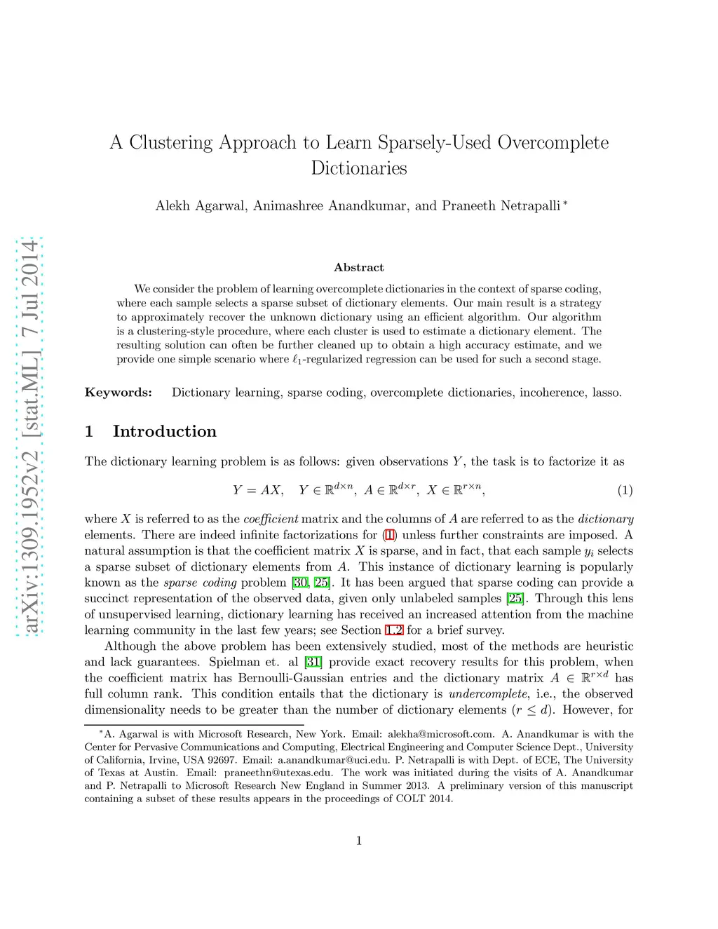 We consider the problem of learning overcomplete dictionaries in the context of sparse coding, where each sample selects a sparse subset of dictionary elements. Our main result is a strategy to approximately recover the unknown dictionary using an efficient algorithm. Our algorithm is a clustering-style procedure, where each cluster is used to estimate a dictionary element. The resulting solution can often be further cleaned up to obtain a high accuracy estimate, and we provide one simple scenario where -regularized regression can be used for such a second stage.