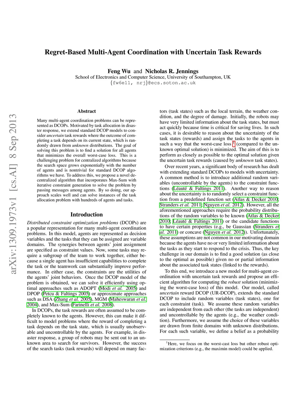 Regret-Based Multi-Agent Coordination with Uncertain Task Rewards