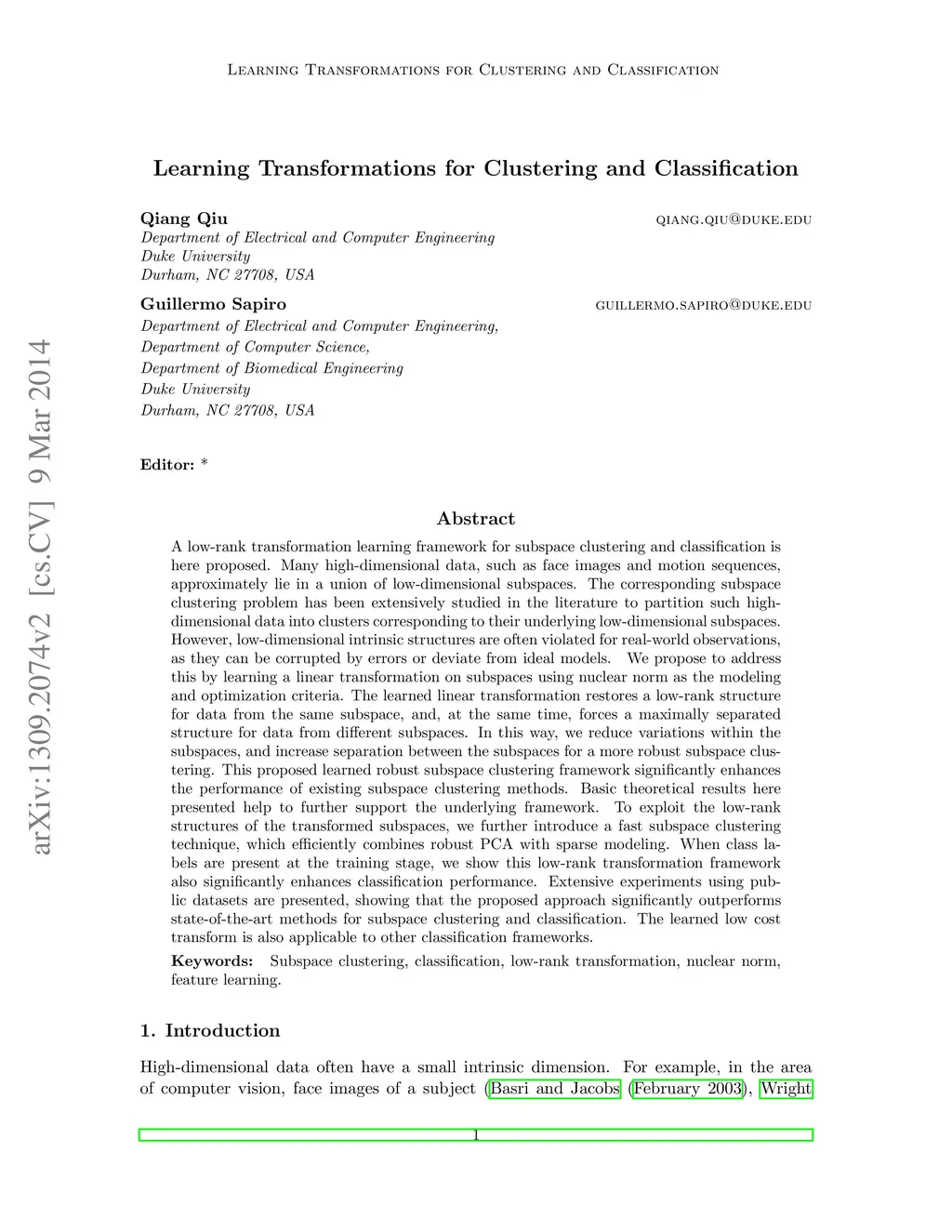 A low-rank transformation learning framework for subspace clustering and classification is here proposed. Many high-dimensional data, such as face images and motion sequences, approximately lie in a union of low-dimensional subspaces. The corresponding subspace clustering problem has been extensively studied in the literature to partition such high-dimensional data into clusters corresponding to their underlying low-dimensional subspaces. However, low-dimensional intrinsic structures are often violated for real-world observations, as they can be corrupted by errors or deviate from ideal models. We propose to address this by learning a linear transformation on subspaces using matrix rank, via its convex surrogate nuclear norm, as the optimization criteria. The learned linear transformation restores a low-rank structure for data from the same subspace, and, at the same time, forces a a maximally separated structure for data from different subspaces. In this way, we reduce variations within subspaces, and increase separation between subspaces for a more robust subspace clustering. This proposed learned robust subspace clustering framework significantly enhances the performance of existing subspace clustering methods. Basic theoretical results here presented help to further support the underlying framework. To exploit the low-rank structures of the transformed subspaces, we further introduce a fast subspace clustering technique, which efficiently combines robust PCA with sparse modeling. When class labels are present at the training stage, we show this low-rank transformation framework also significantly enhances classification performance. Extensive experiments using public datasets are presented, showing that the proposed approach significantly outperforms state-of-the-art methods for subspace clustering and classification.