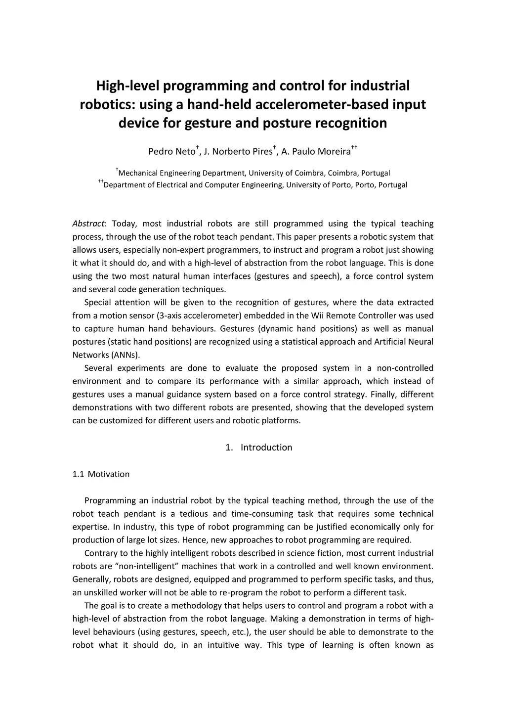 Purpose - Most industrial robots are still programmed using the typical teaching process, through the use of the robot teach pendant. This is a tedious and time-consuming task that requires some technical expertise, and hence new approaches to robot programming are required. The purpose of this paper is to present a robotic system that allows users to instruct and program a robot with a high-level of abstraction from the robot language. Design/methodology/approach - The paper presents in detail a robotic system that allows users, especially non-expert programmers, to instruct and program a robot just showing it what it should do, in an intuitive way. This is done using the two most natural human interfaces (gestures and speech), a force control system and several code generation techniques. Special attention will be given to the recognition of gestures, where the data extracted from a motion sensor (three-axis accelerometer) embedded in the Wii remote controller was used to capture human hand behaviours. Gestures (dynamic hand positions) as well as manual postures (static hand positions) are recognized using a statistical approach and artificial neural networks. Practical implications - The key contribution of this paper is that it offers a practical method to program robots by means of gestures and speech, improving work efficiency and saving time. Originality/value - This paper presents an alternative to the typical robot teaching process, extending the concept of human-robot interaction and co-worker scenario. Since most companies do not have engineering resources to make changes or add new functionalities to their robotic manufacturing systems, this system constitutes a major advantage for small- to medium-sized enterprises.