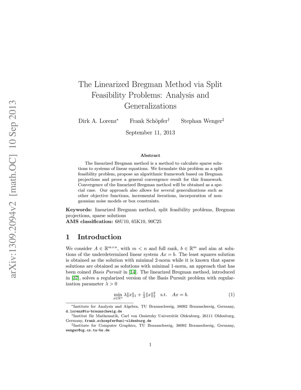 The linearized Bregman method is a method to calculate sparse solutions to systems of linear equations. We formulate this problem as a split feasibility problem, propose an algorithmic framework based on Bregman projections and prove a general convergence result for this framework. Convergence of the linearized Bregman method will be obtained as a special case. Our approach also allows for several generalizations such as other objective functions, incremental iterations, incorporation of non-gaussian noise models or box constraints.