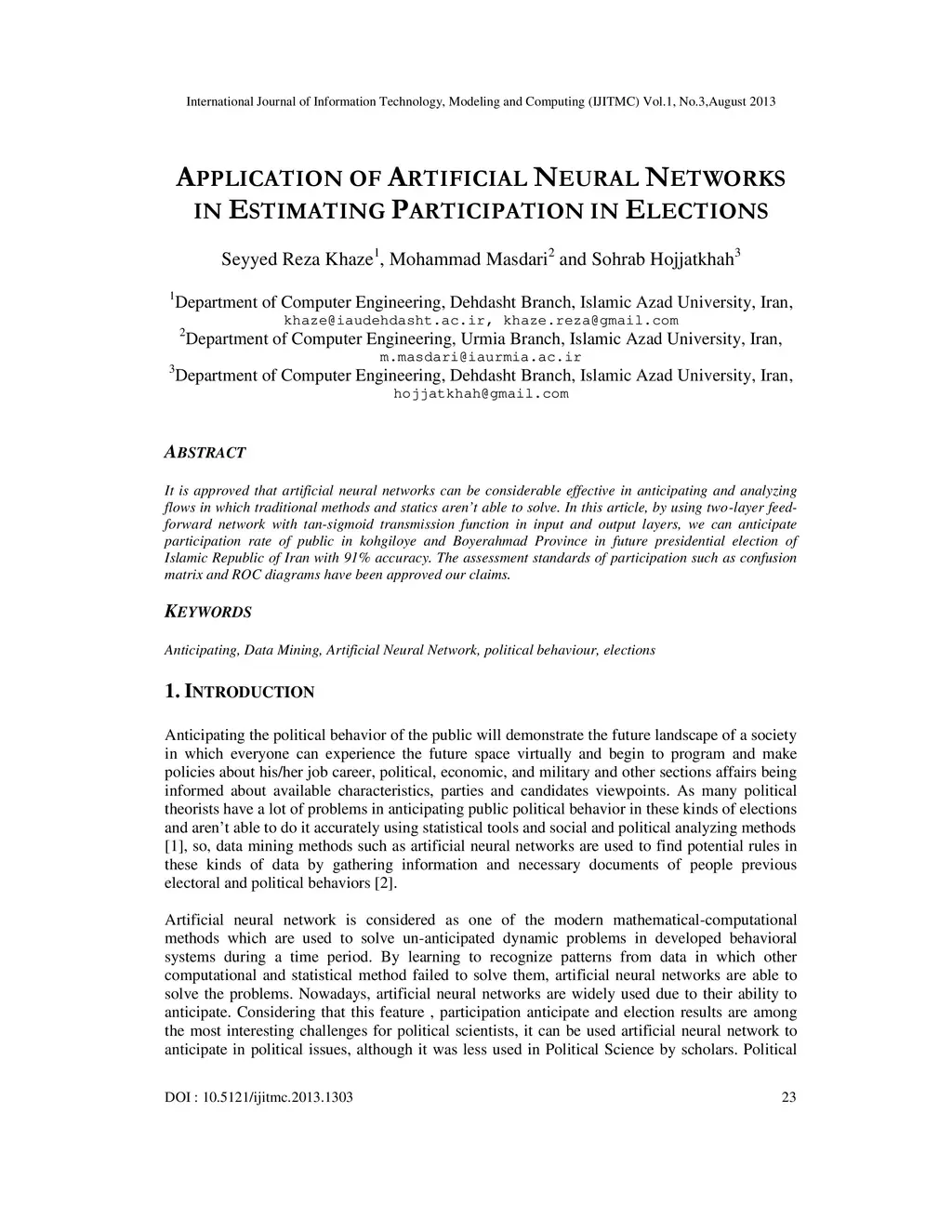 It is approved that artificial neural networks can be considerable effective in anticipating and analyzing flows in which traditional methods and statics are not able to solve. in this article, by using two-layer feedforward network with tan-sigmoid transmission function in input and output layers, we can anticipate participation rate of public in kohgiloye and boyerahmad province in future presidential election of islamic republic of iran with 91% accuracy. the assessment standards of participation such as confusion matrix and roc diagrams have been approved our claims.