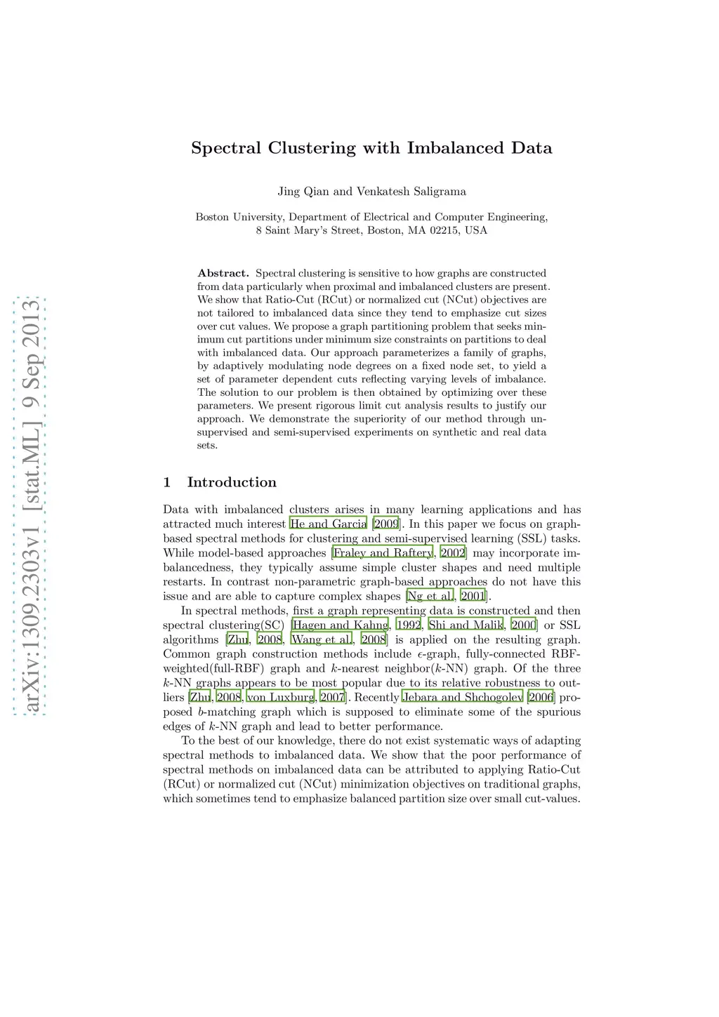 Spectral clustering is sensitive to how graphs are constructed from data particularly when proximal and imbalanced clusters are present. We show that Ratio-Cut (RCut) or normalized cut (NCut) objectives are not tailored to imbalanced data since they tend to emphasize cut sizes over cut values. We propose a graph partitioning problem that seeks minimum cut partitions under minimum size constraints on partitions to deal with imbalanced data. Our approach parameterizes a family of graphs, by adaptively modulating node degrees on a fixed node set, to yield a set of parameter dependent cuts reflecting varying levels of imbalance. The solution to our problem is then obtained by optimizing over these parameters. We present rigorous limit cut analysis results to justify our approach. We demonstrate the superiority of our method through unsupervised and semi-supervised experiments on synthetic and real data sets.